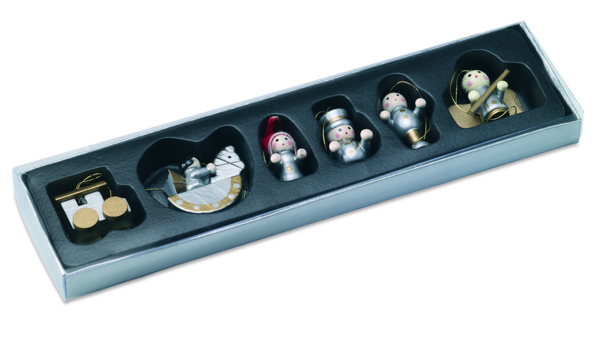 Set mit 6 Weihnachtsbaumanhängern aus Holz. Verschiedene Motive. Verpackt in einer Geschenkschachtel mit transparentem Deckel.
