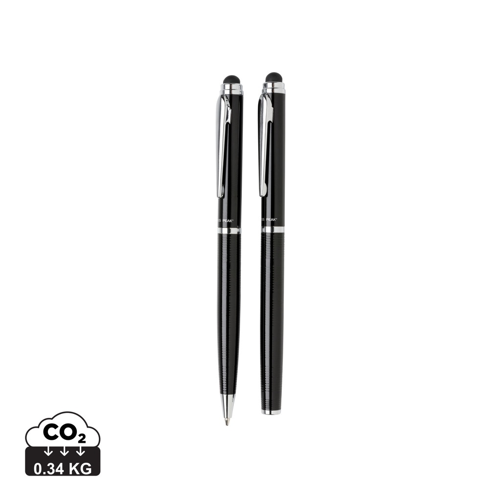 Ein Set aus Stylus Kugelschreiber und Stylus Rollerball mit wunderschönen feinen Linien am Schaft und einem besonderen Platz für Ihr Logo. Blauschreibend. Inklusive Swiss Peak Röhren-Geschenkverpackung.
