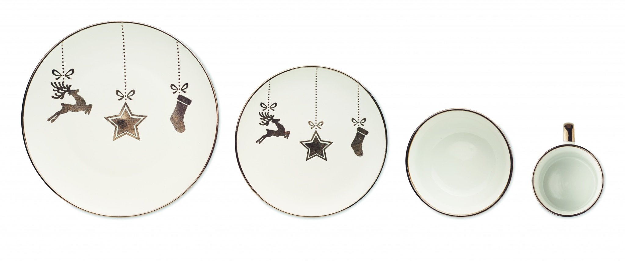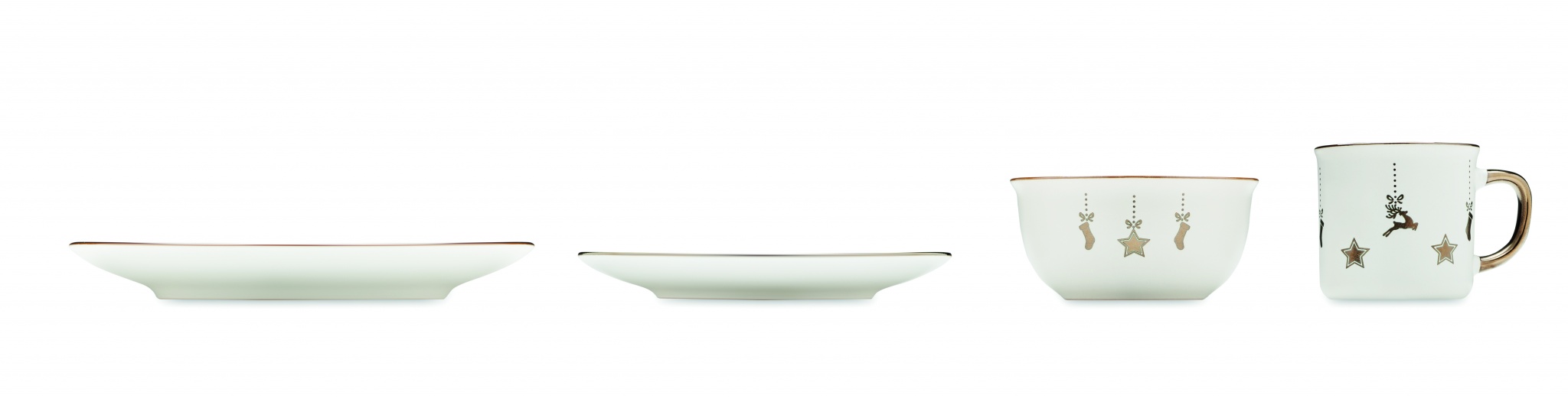 Weihnachtliches 4-teiliges Geschirr-Set aus Keramik. Bestehend aus großem Teller, Frühstücksteller, Müsli-/Salatschale (500 ml) und Becher (300 ml). Lieferung in einer Geschenkbox.