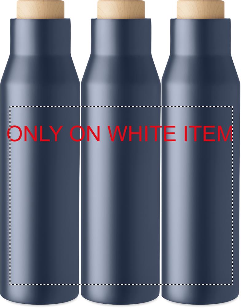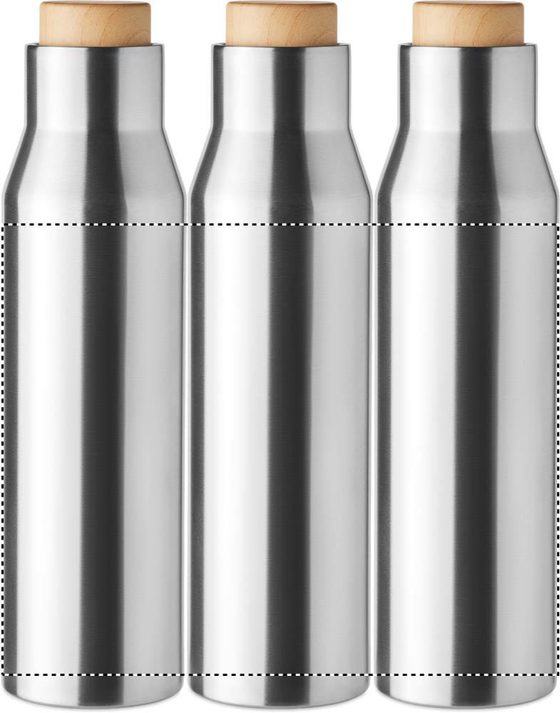 Doppelwandige Isolierflasche aus Edelstahl. Verschluss aus Bambus- Imitat. Füllmenge: 500 ml. Auslaufsicher.