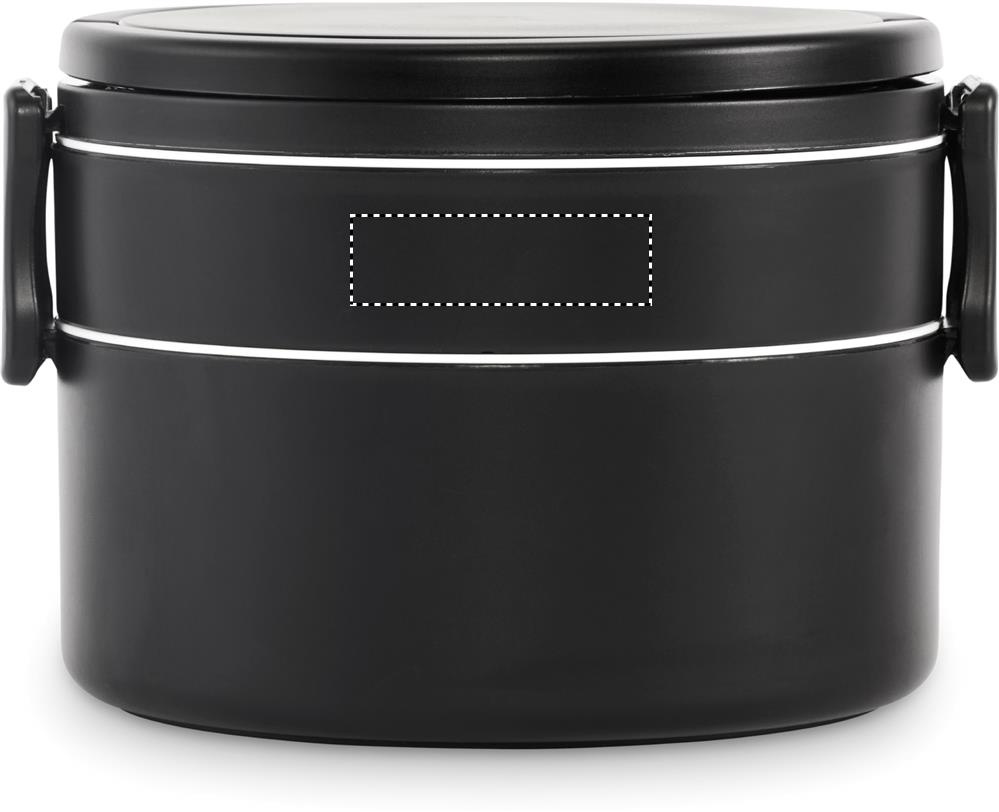 Runde Lunchbox mit 2 Ebenen aus PP. Mit seitlichen Halteklammern und Griffen. Inkl. Innendeckel in Weiß. Füllmenge: oben 250 ml, unten 700 ml.