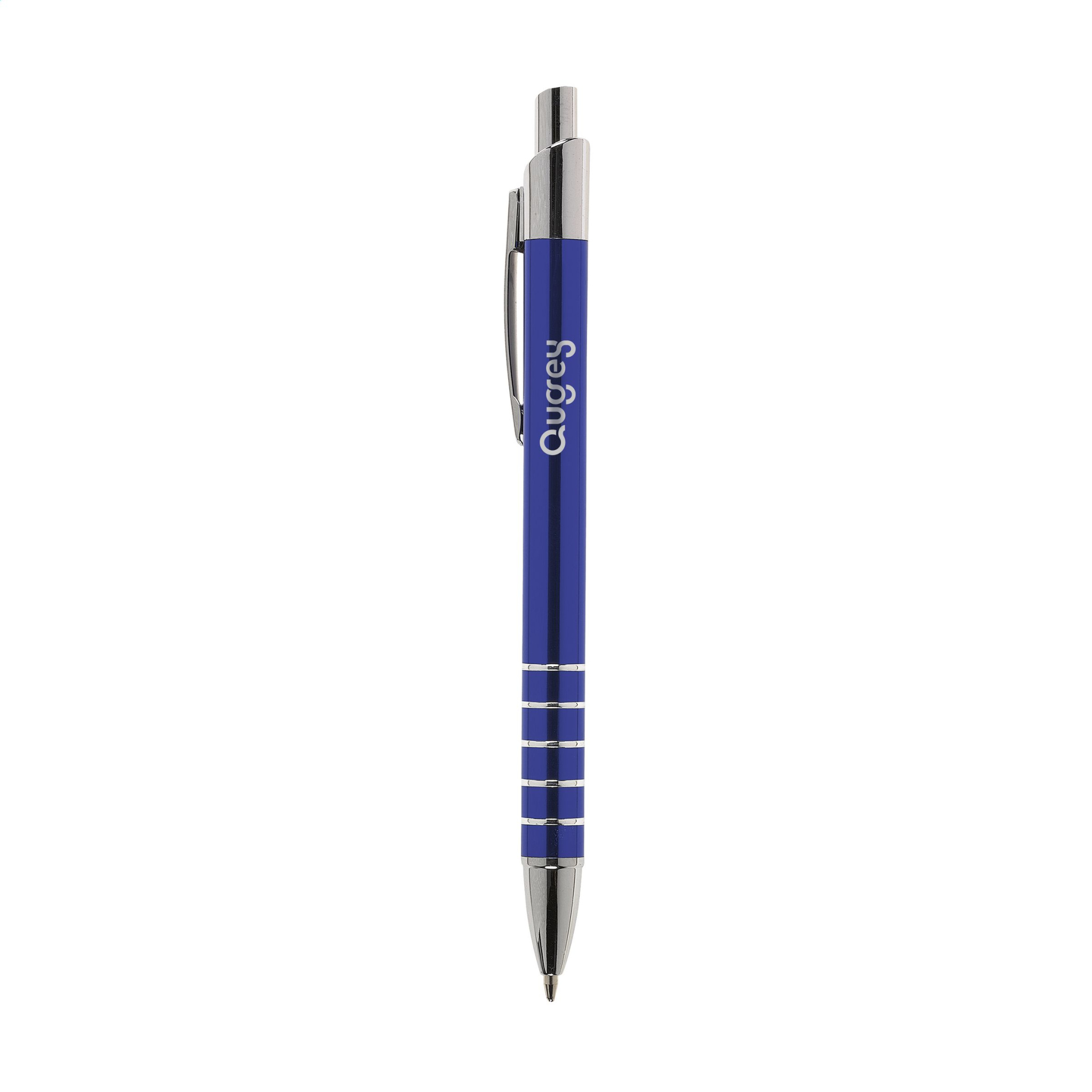Blauschreibender Aluminium-Kugelschreiber im Metallic-Look mit Clip und Zierelementen aus Metall.