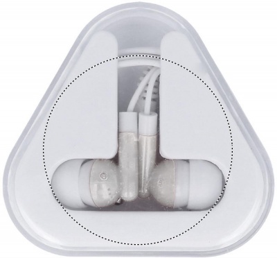 Ohrhörer in einem dreieckigen Kunststoff-Etui. Kabellänge 120 cm.