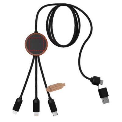 5-in-1 Ladekabel aus rPET mit leuchtendem Logo und rundem Bambusgehäuse. Das leuchtende Logo ist auf beiden Seiten sichtbar. Mit 3 Anschlüssen (Typ C, Micro-USB, iPhone) und einem dualen USB-Anschluss für den universellen Einsatz. Geliefert in einem TPU-Beutel, mit einer Karte aus Kraftpapier. Länge des Kabels: 1 Meter. Inklusive 3 Jahre Garantie.