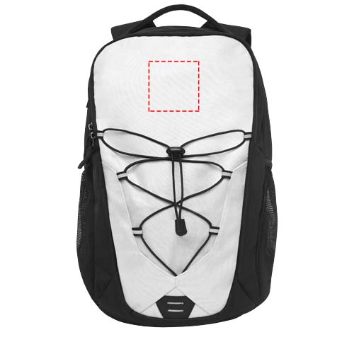 Eine Mischung aus Outdoor- und Alltagsrucksack aus farbigem Stoff und elastischer Kordel mit reflektierenden Akzenten auf der Vorderseite. Ausgestattet mit zwei Netz-Außentaschen für Wasserflaschen, einem Frontfach mit mehreren kleinen Fächern, einem Haken und einer 12-Zoll-Tablethülle. Der Rucksack hat einen gepolsterten, verstärkten Griff und eine bequeme, gepolsterte Rückseite. Geeignet für einen 15,6-Zoll-Laptop in einer gepolsterten Hülle im Hauptfach.