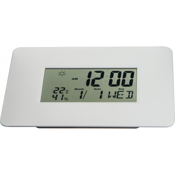 Digitale Wanduhr mit Kalender, Alarm- und Schlummerfunktion, Thermometer und Hygrometer (automatische Aktualisierung der Werte alle 20 Sekunden) und einer Wetteranzeige. Exklusive 2 AAA-Batterien, diese gleich mitbestellen (Art. 999400).Temperaturmessung in F oder CEinstellung des Zyklus auf 12 Stunden (AM 12:00) oder 24 Stunden (0:00)Erkennt Temperaturen von -50 bis 70 CErkennt Flüssigkeitszufuhr von 20 bis 89 %Zeigt 3 Wettermodi an: sonnig, bewölkt, regnerisch
