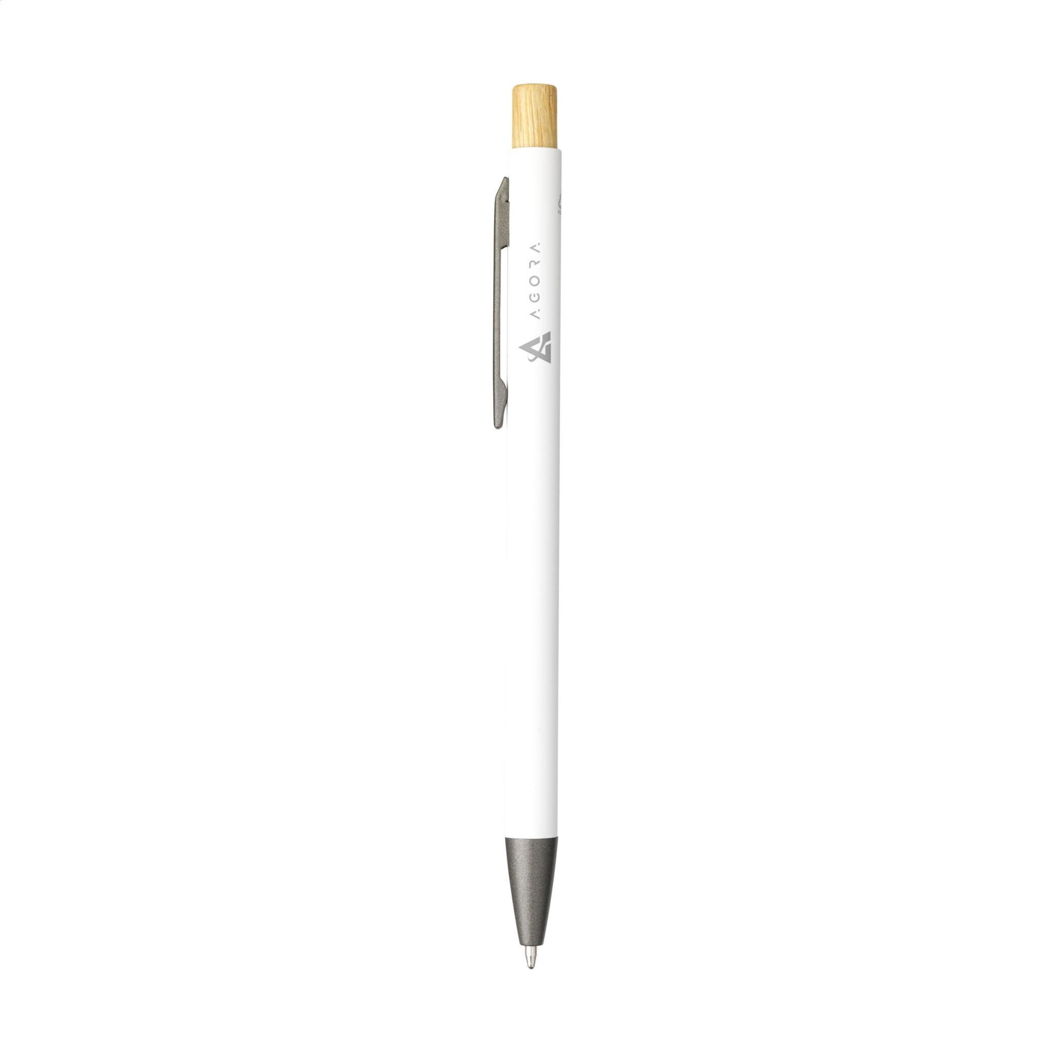WoW! Blauschreibender, schlanker Kugelschreiber mit Schaft aus recyceltem Aluminium mit gummierter Oberfläche. Metallclip. Schlankes Design. Der Bambus-Druckknopf verleiht dem Stift eine natürliche Note. GRS-zertifiziert. Gesamtes recyceltes Material: 78 %. Durch die Verwendung von recyceltem Aluminium werden bei der Produktion weniger neue Rohstoffe verwendet. Dies bedeutet weniger Energieverbrauch und weniger Wasserverbrauch. Eine verantwortungsvolle Wahl.