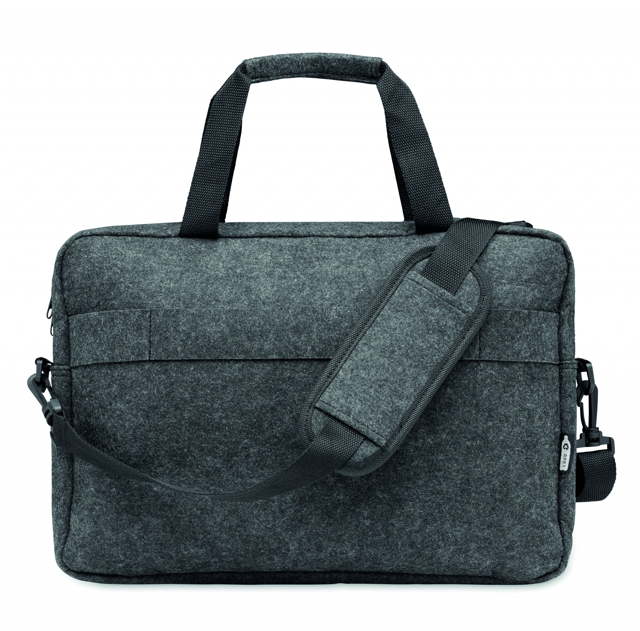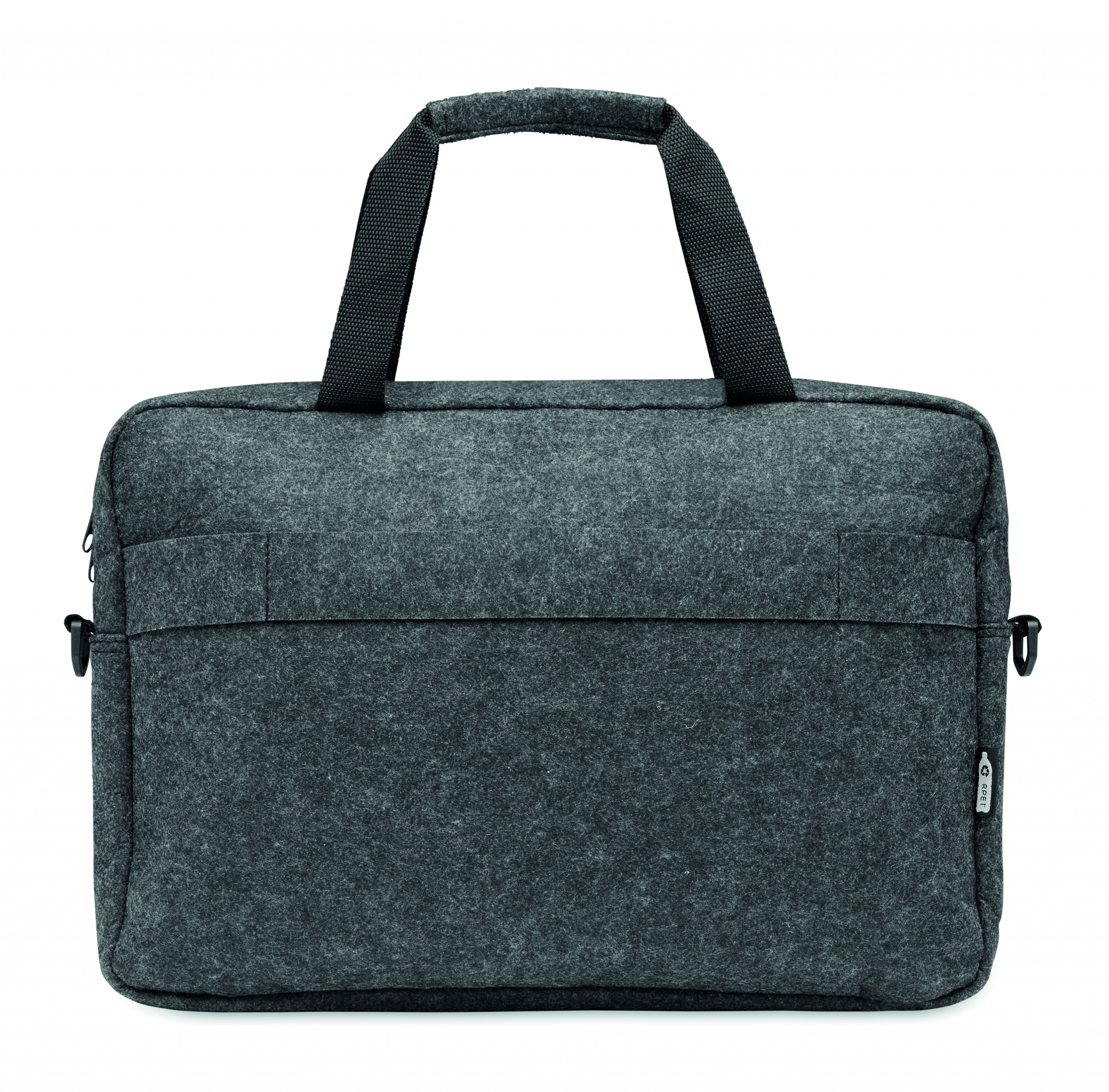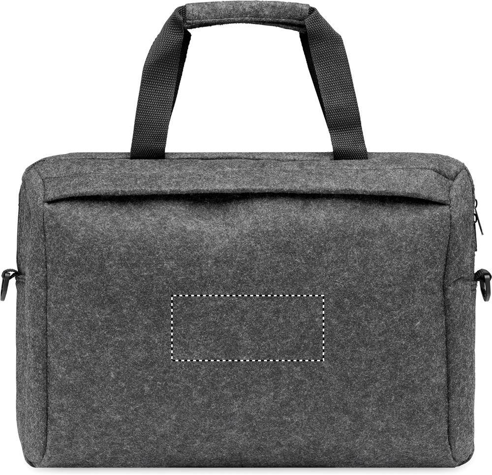 15 inch laptop bag in RPET felt including one main internal compartment and one zippered front pocket. Includes detachable and adjustable shoulder strap. Trolley holder on reverse side.