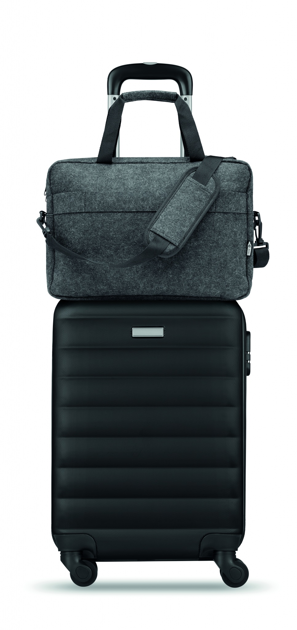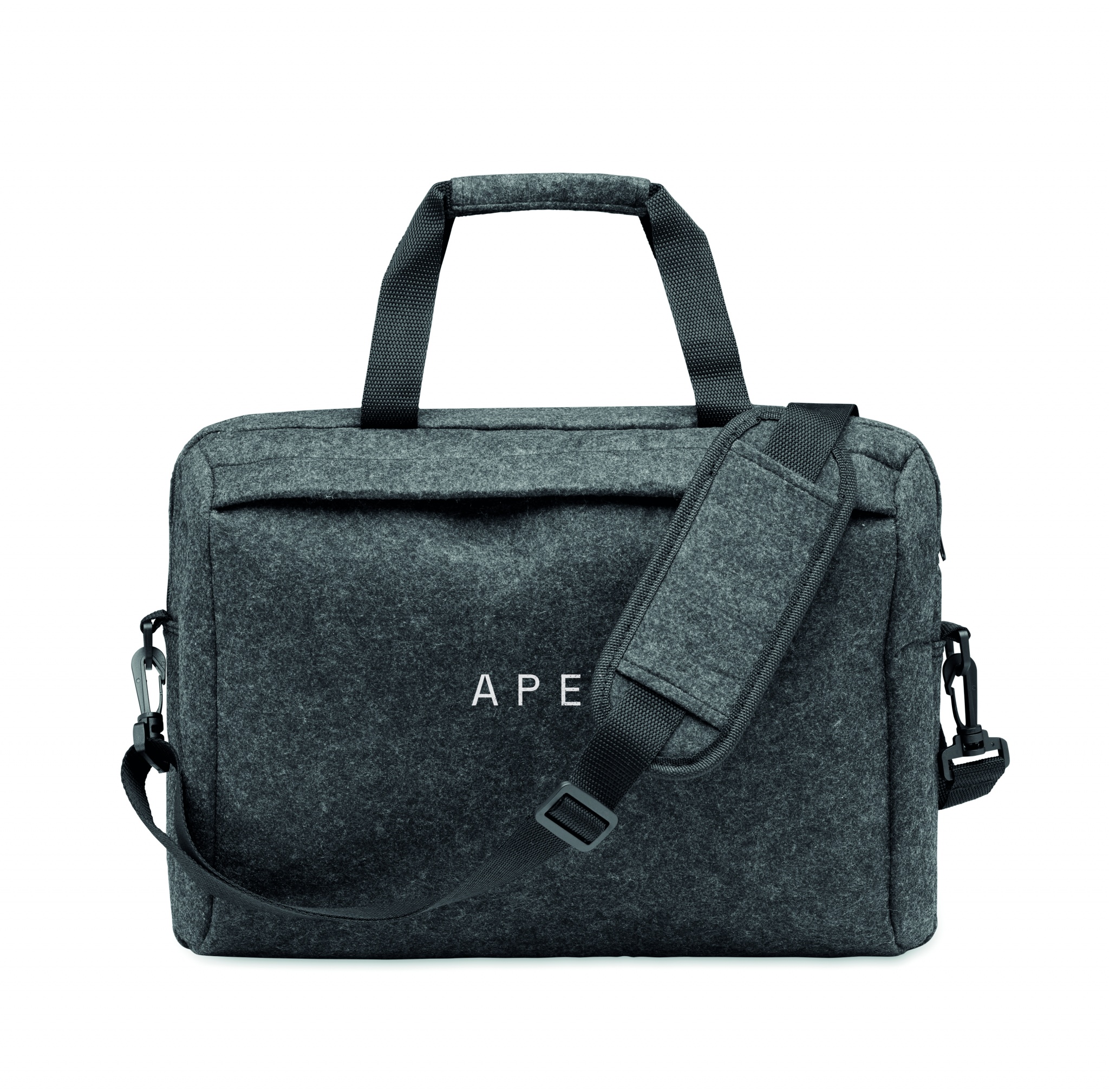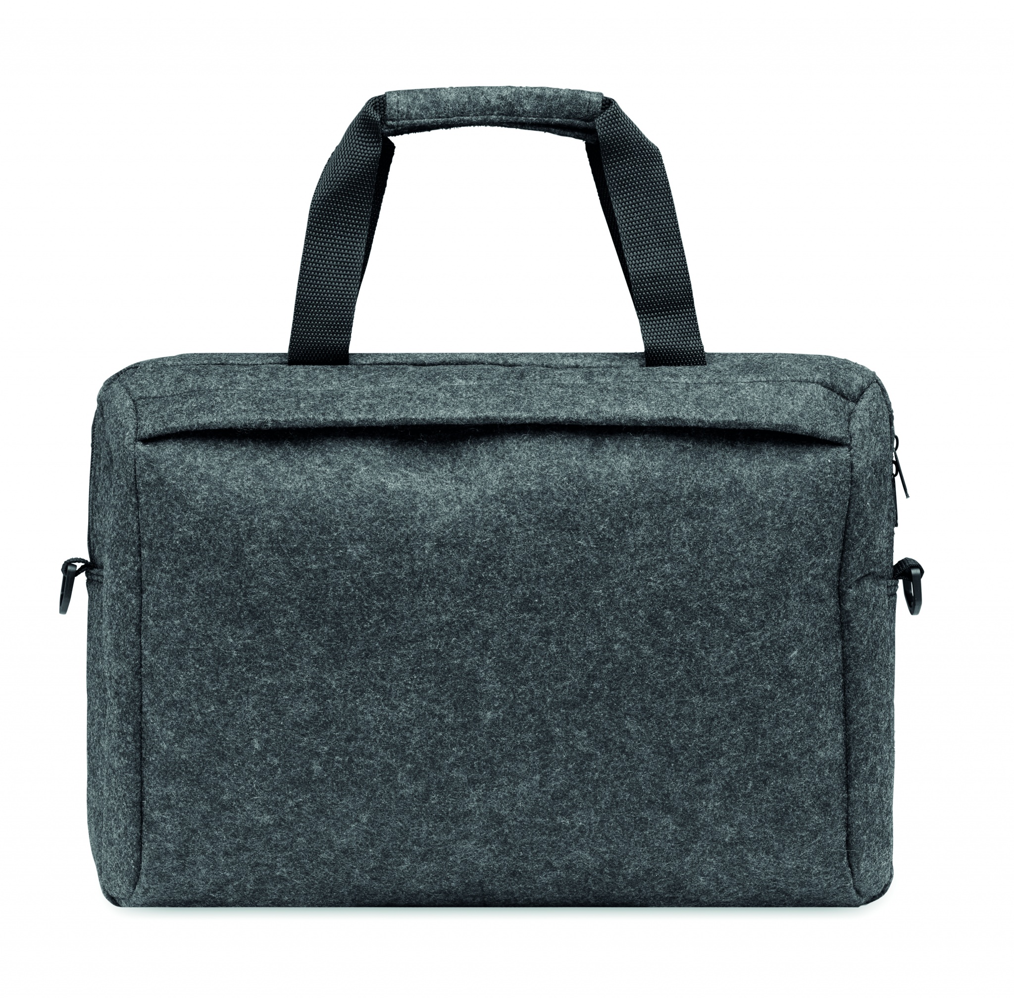 15 inch laptop bag in RPET felt including one main internal compartment and one zippered front pocket. Includes detachable and adjustable shoulder strap. Trolley holder on reverse side.