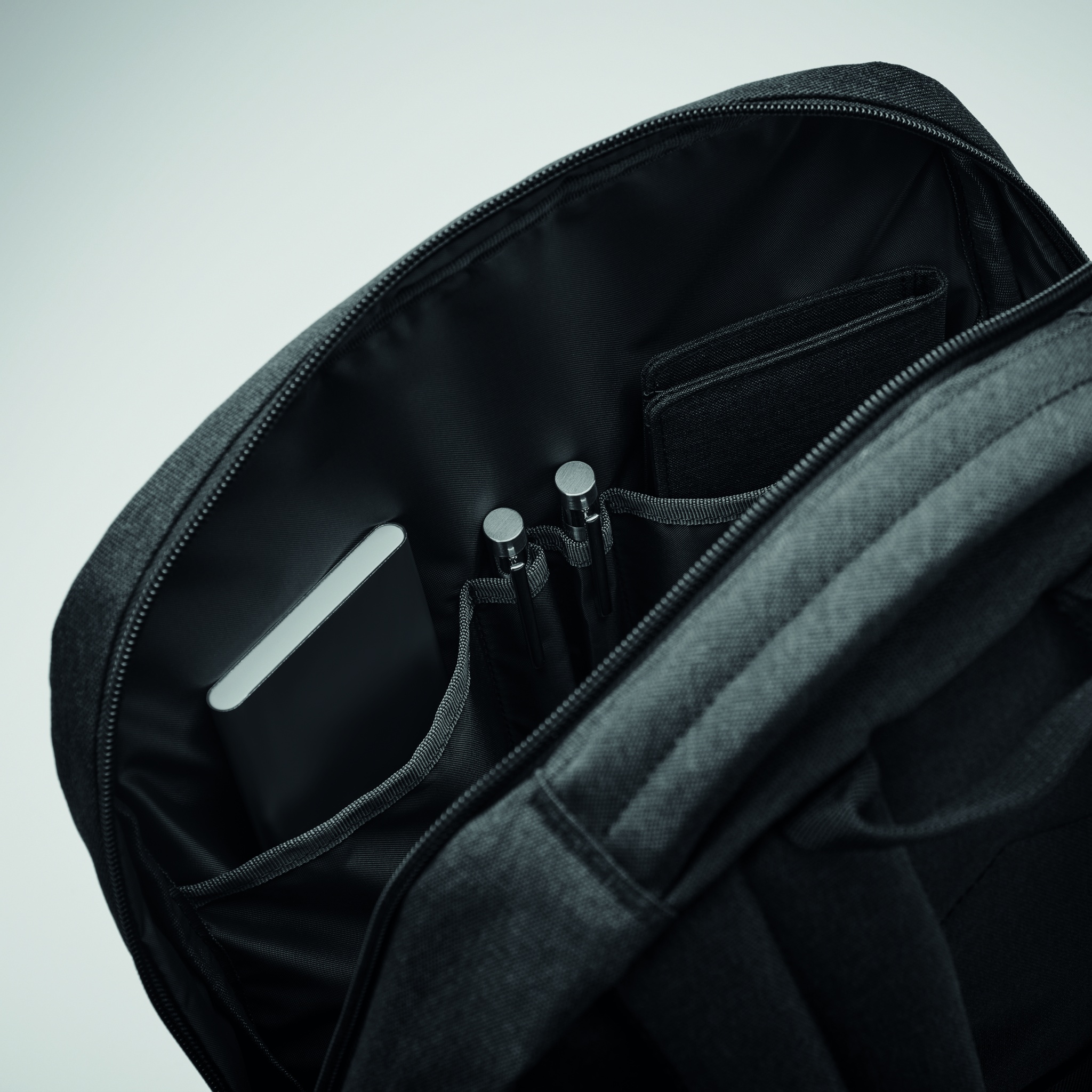 15 inch laptop backpack in 600D RPET polyester. Internal laptop compartment and several small inner compartments. It has a front zippered pocket and 2 side mesh pockets. Adjustable shoulder straps. Trolley holder on reverse side.