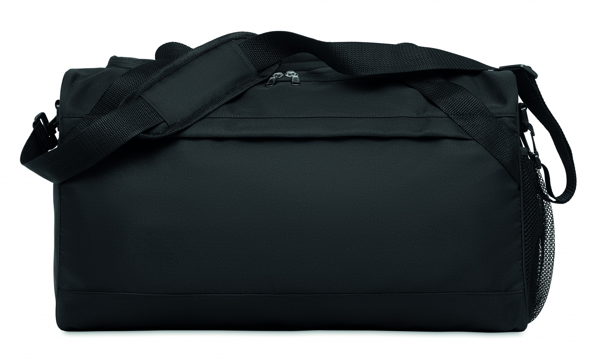 Sport or travelling bag in 600D RPET with large zippered front pocket, inside zippered pocket and adjustable and detachable shoulder strap.