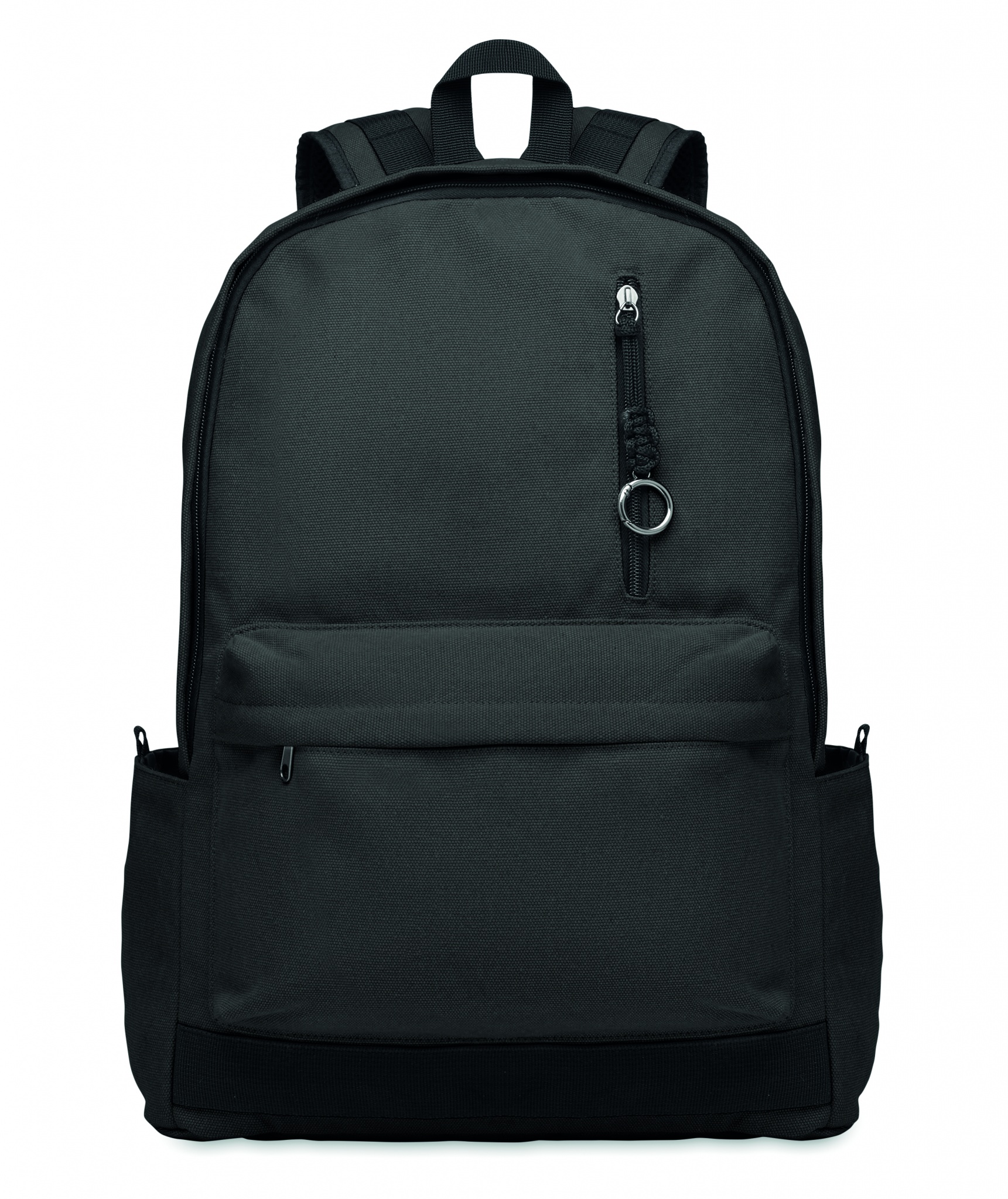 15inch laptop backpack in recycled washed canvas. Large front zippered pocket with inner laptop compartment. Small front zippered pocket. Two side-slip pockets. Padded back and shoulder straps, back panel and base. 450 gr/m².
