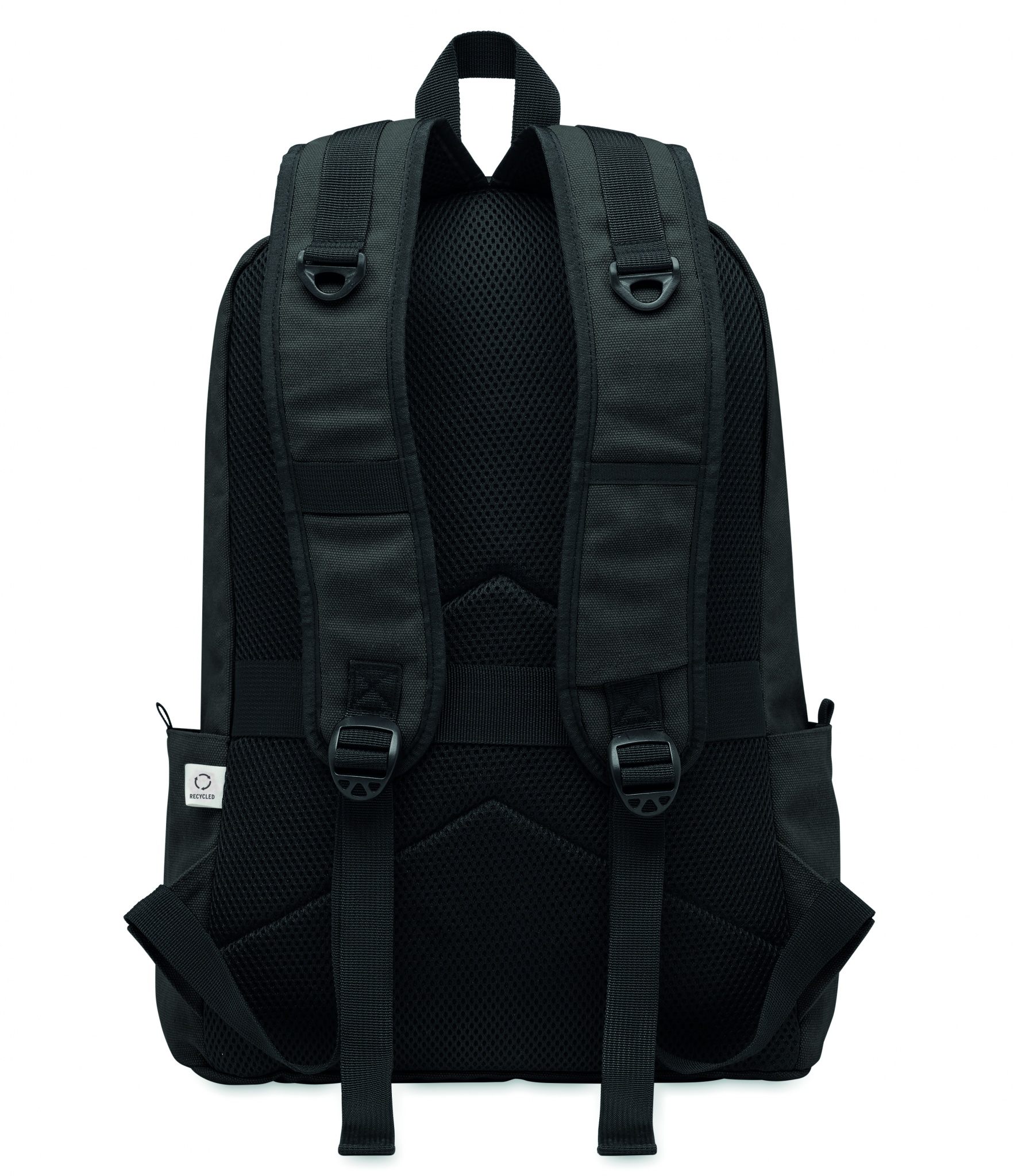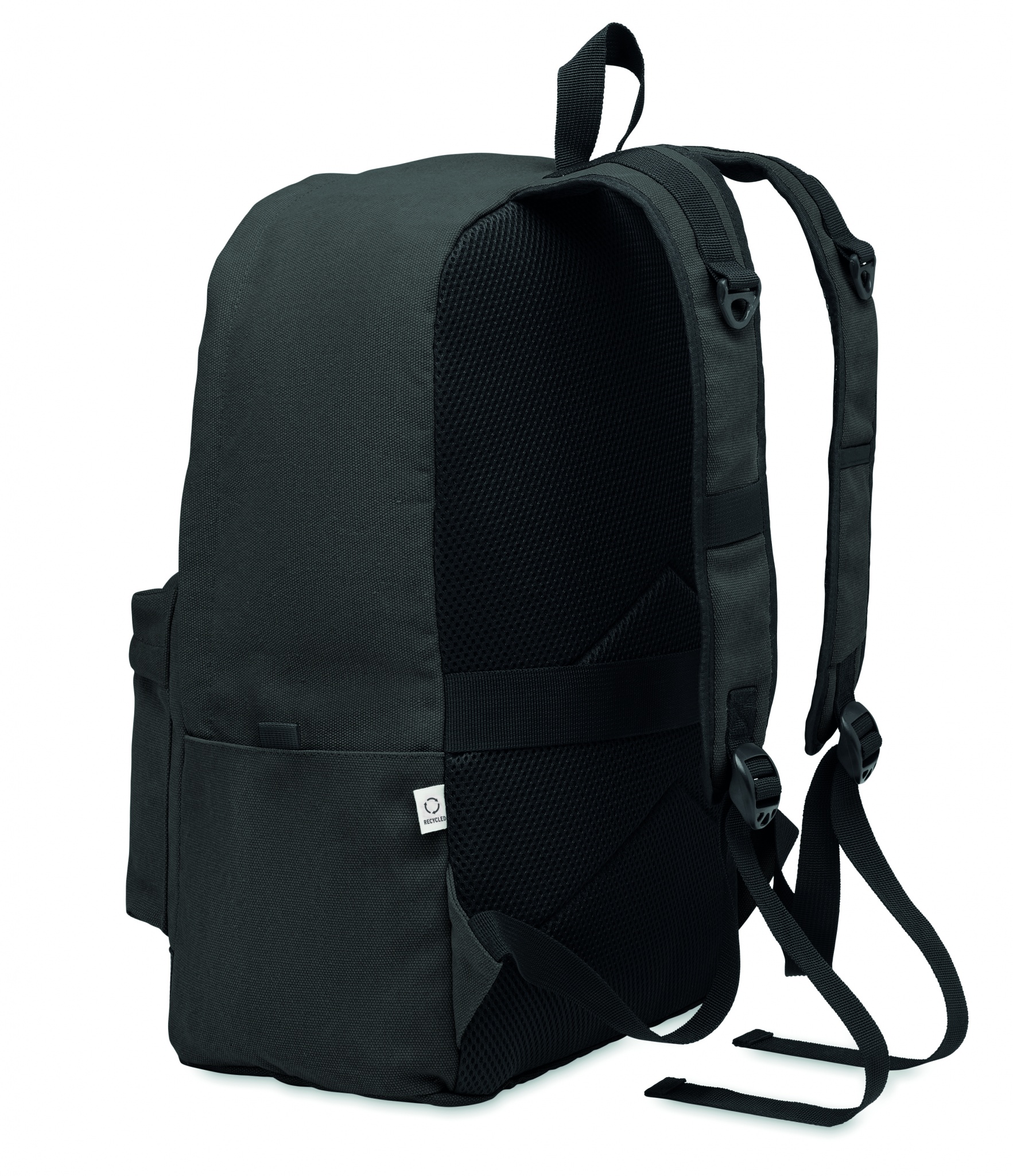 A 15-inch laptop backpack made of recycled pre-consumer cotton with customizable printing, Black
