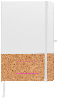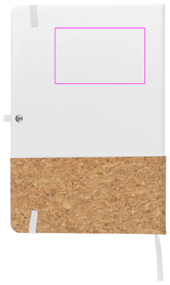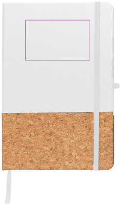 A5 notebook with 160 lined pages and PU cork cover, bookmark, ballpen loop, and elastic closure band. We print your logo on the front.