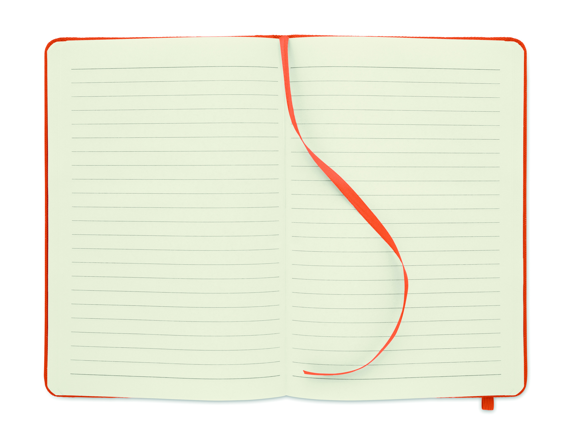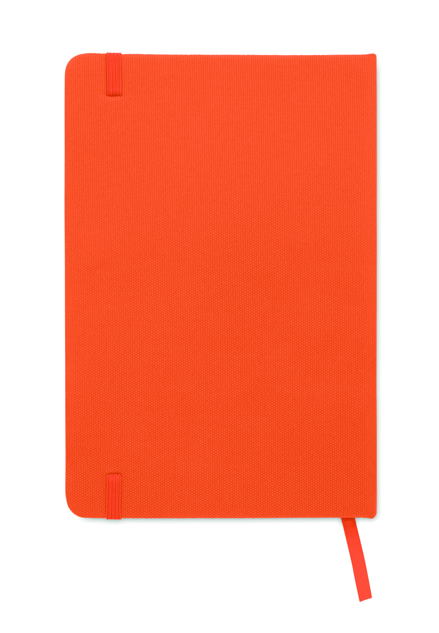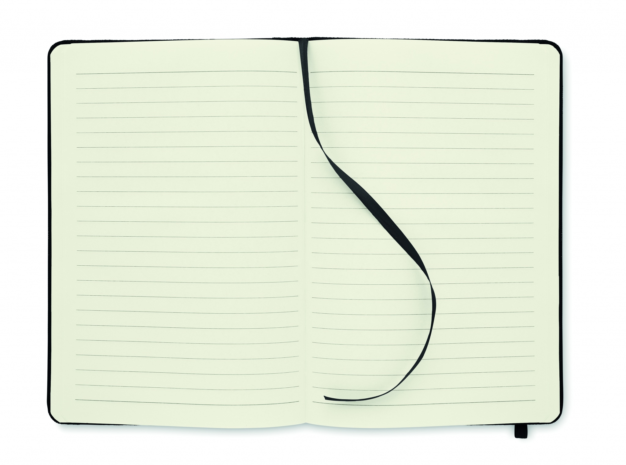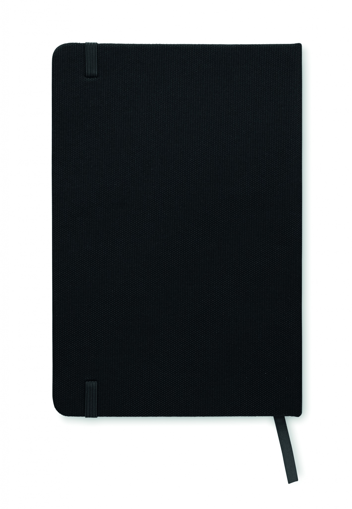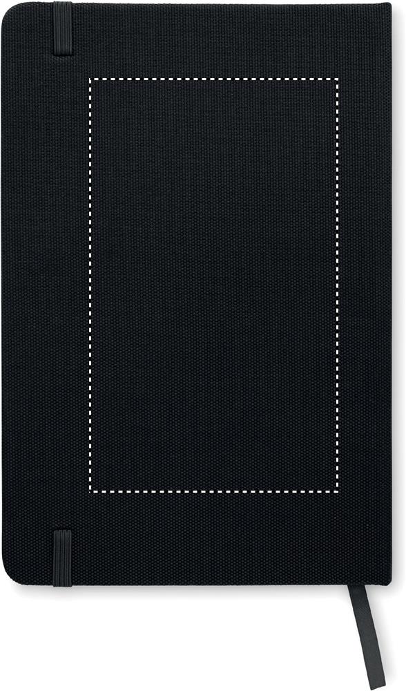 A5 notebook with hard 600D RPET cover. Casebound. 160 lined recycled paper pages (80 sheets). Matching elastic closure strap and ribbon bookmark.