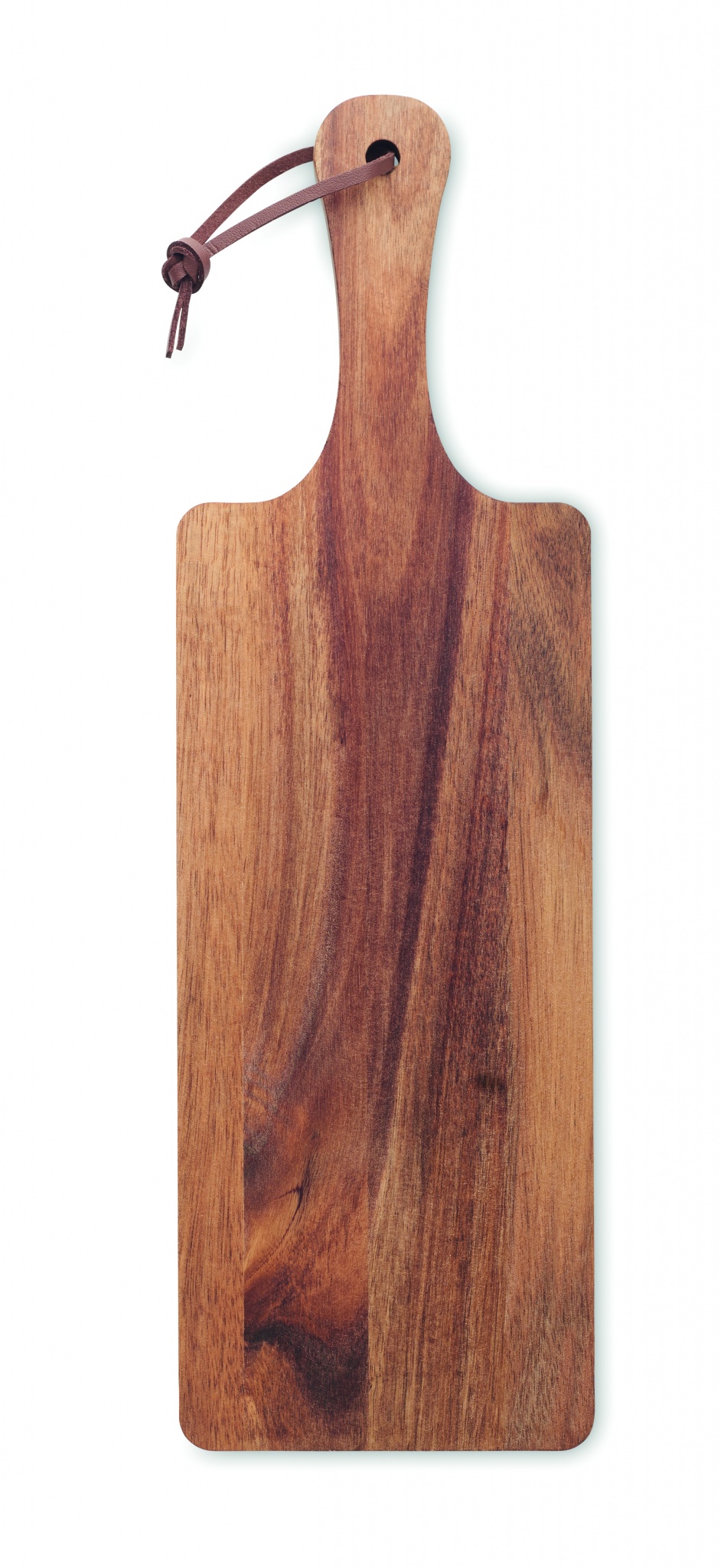 Acacia wood serving board with handle and PU cord. Wood is a natural product, there may be slight variations in colour and size per item, which can affect the final decoration outcome.