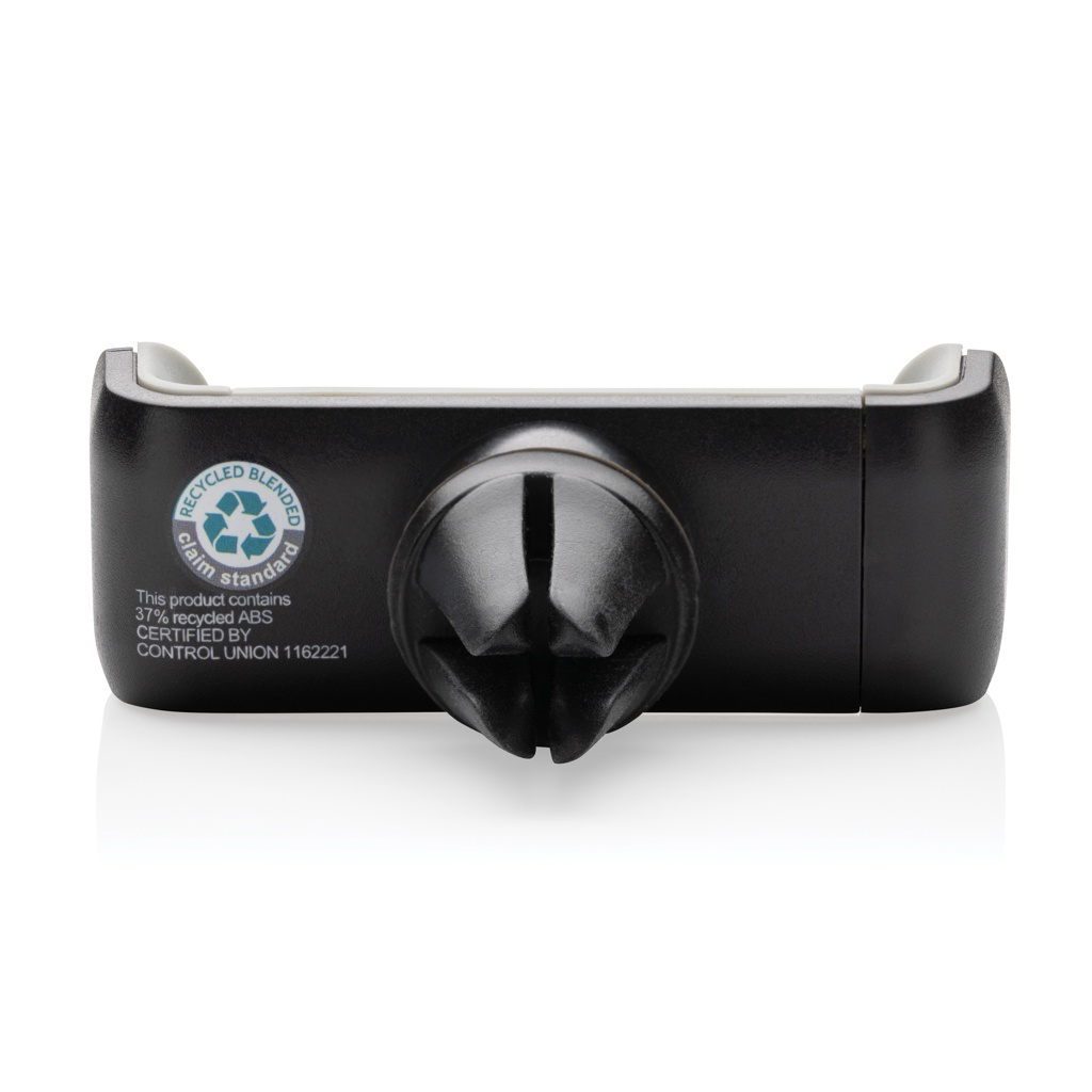 Universal and 360 degree rotatable car mount made with RCS (Recycled Claim Standard) certified recycled ABS. Total recycled content: 37% based on total item weight. RCS certification ensures a completely certified supply chain of the recycled materials. Simply click the item on your air vent and place your mobile phone (up to 6”) in the holder. Made out of heat resistant recycled ABS and strong silicone to make the item long lasting and prevent it from falling off your air vent while driving. With stainless steel mechanism inside to ensure your phone stays in place