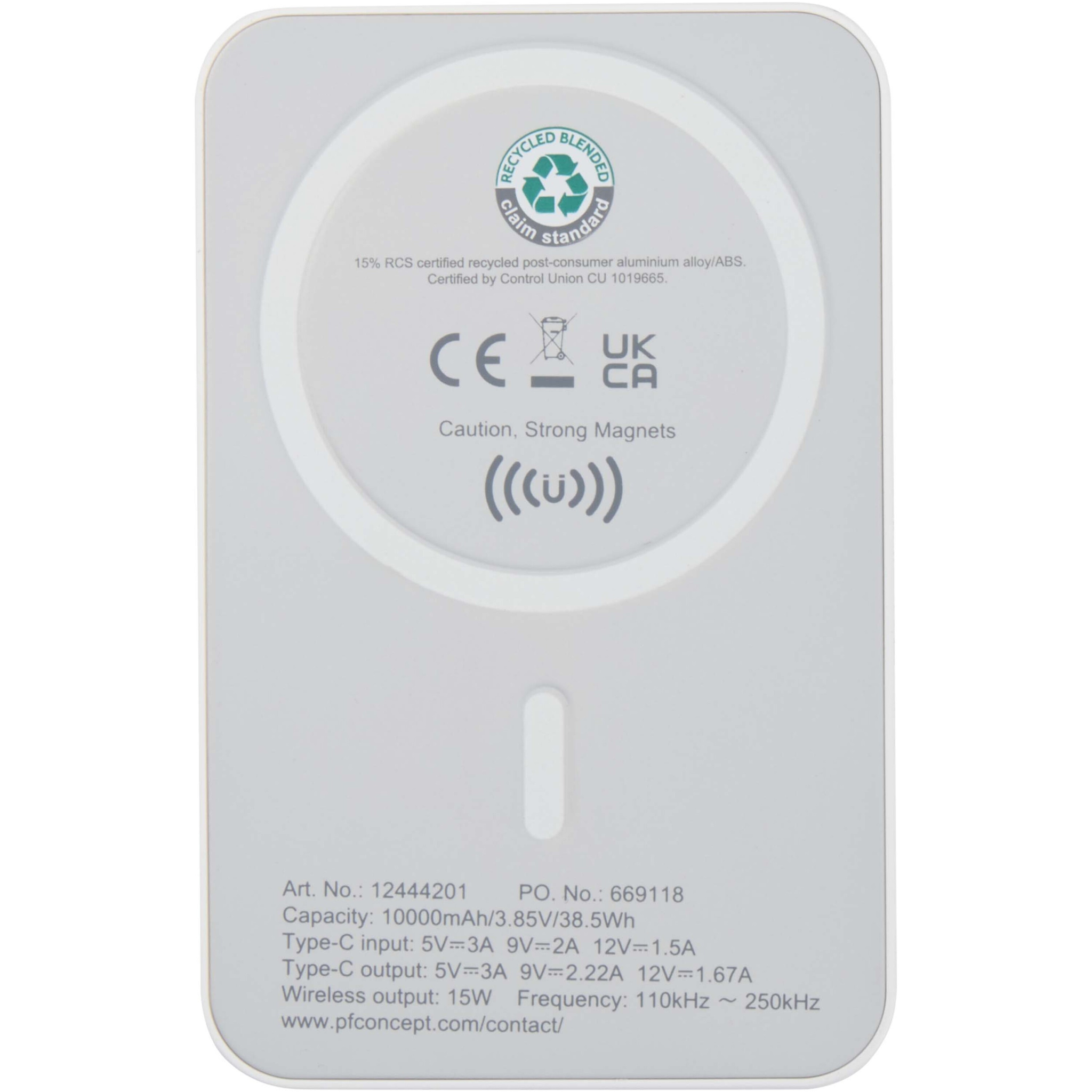 Acrab 10.000 mAh 15W magnetic wireless power bank with 20W PD - made from recycled plastic, White