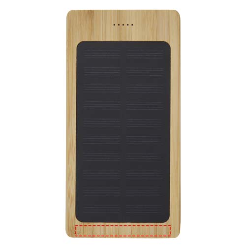 8000mAh bamboo power bank with dual USB output. Integrated solar panel for quick topup charging, ideal for outdoor activities. 5V/2A Type-C input, 5V/1A USB output 1 and 5V/2A USB output 2. No accessory cable provided for sustainability purposes. Delivered in a gift box with an instruction manual (both made of sustainable materials).