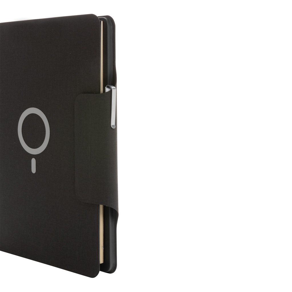 Charge your mobile device wirelessly at full speed with this A4 PU material notebook portfolio with integrated magnetic 10W wireless charger and 8000 mah powerbank. Snap your phone (iPhone 12 or higher) to the wireless charger and the phone will align perfectly with the magnets inside. The 10W wireless charger is compatible with all QI devices (Iphone 8 and up and Android devices) Type-C input 9V/2A; Wireless Output 9V/1.1A; Type-C output 9V/2A. The notebook includes 20 sheets/40 pages of 80 gsm lined paper. With phone/tablet pocket and pen loop. 19 pcs high quality N52H heat resistant magnets integrated. Registered design.