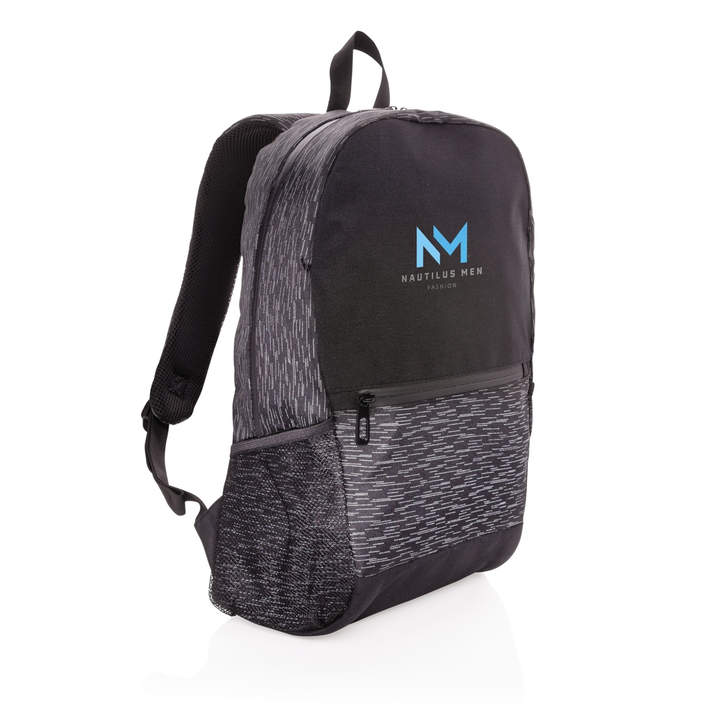 Increase your visibility in style with this backpack made with 100% recycled polyester and AWARE™ tracer. With AWARE™, the use of genuine recycled fabric materials and water reduction impact claims are guaranteed, by using the AWARE disruptive physical tracer and blockchain technology. Save water and use genuine recycled fabrics. The backpack features a modern allover reflective print, a main compartment with 15.6 inch laptop compartment, a front zipper pocket and 2 mesh pockets. Adjustable straps. PVC free. This bag saved 8 liters of water and is made of 16 plastic bottles.
