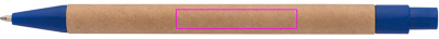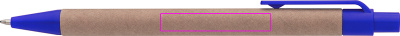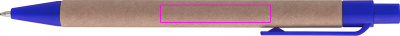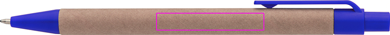 Ballpoint pen made of recycled paper and colored plastic applications, blue writing. Your logo is printed to the right of the clip.
