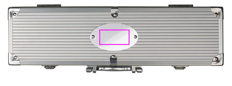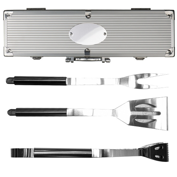 Barbecue case consisting of barbecue tongs, meat fork and barbecue turner in metal case. We laser your logo on the oval metal plate of the case.