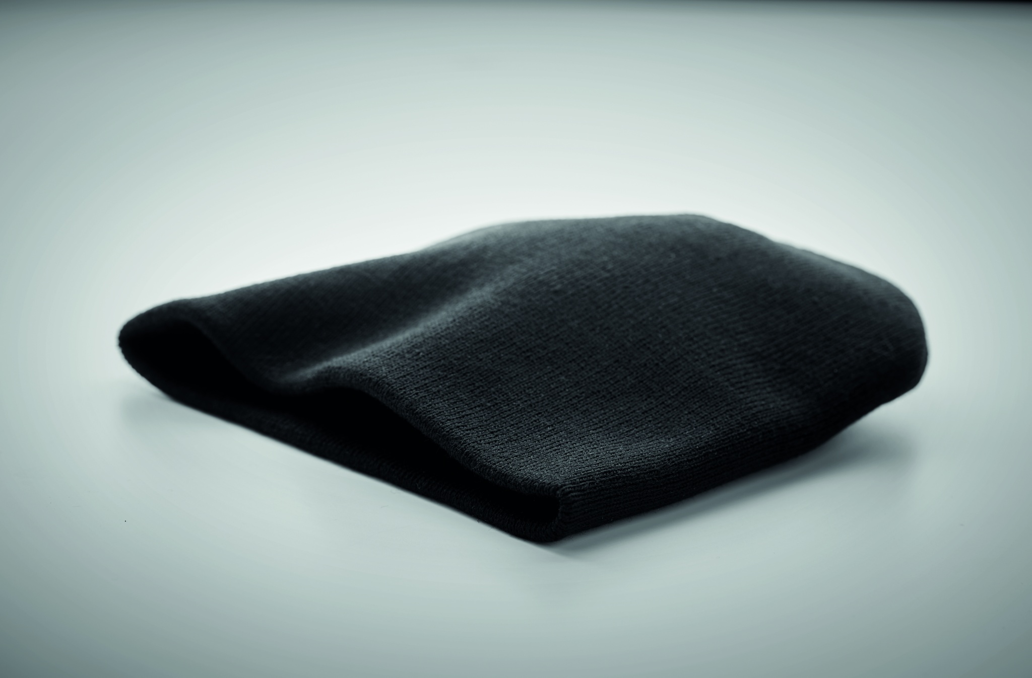 Unisex knitted Beanie hat in soft stretchable RPET polyester.