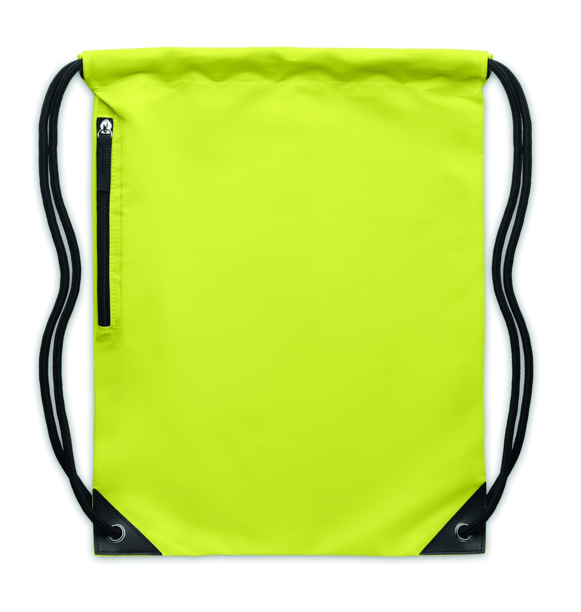 Drawstring bag in 190T polyester coated with with reflective granules. Includes zippered pocket on one side. Thick cord.
