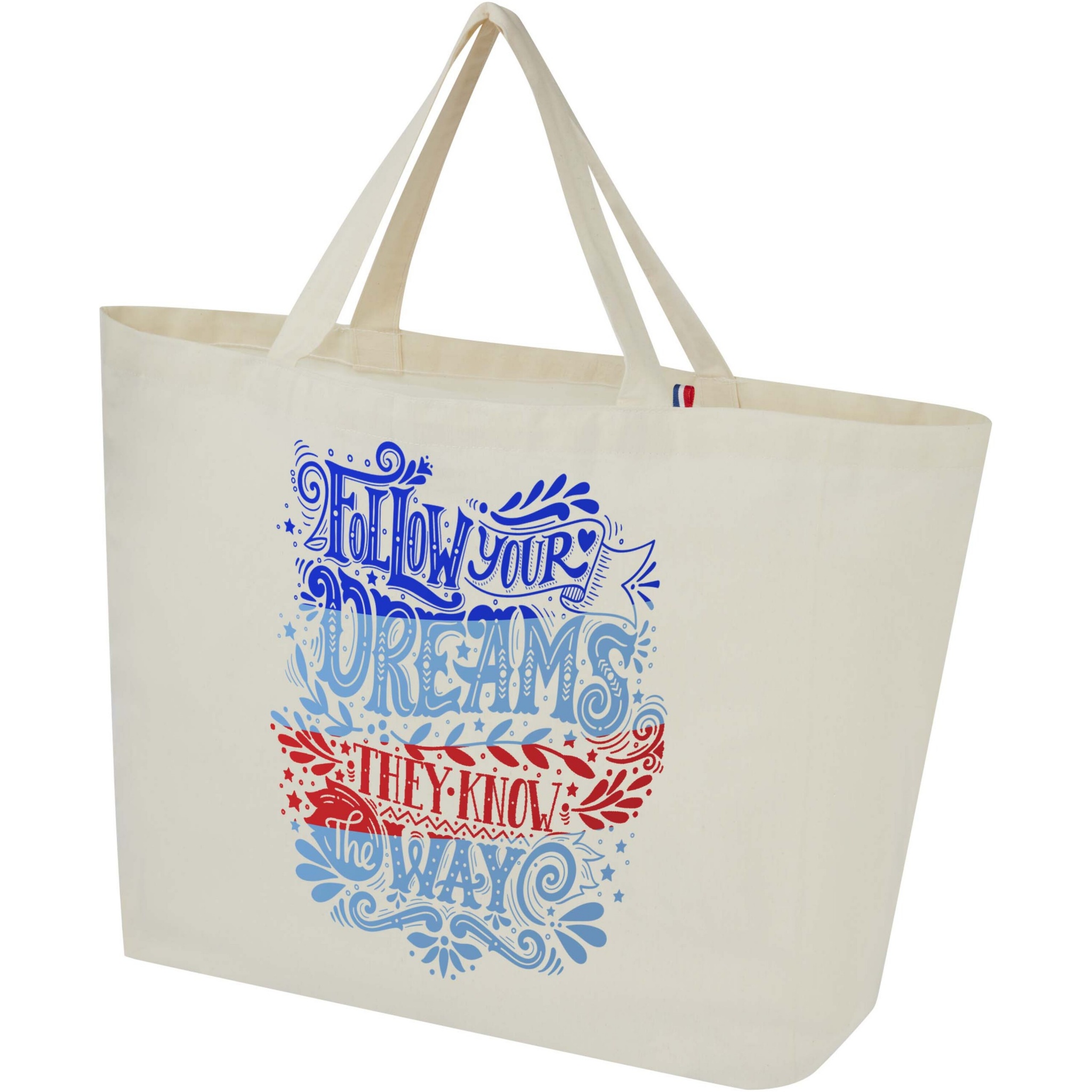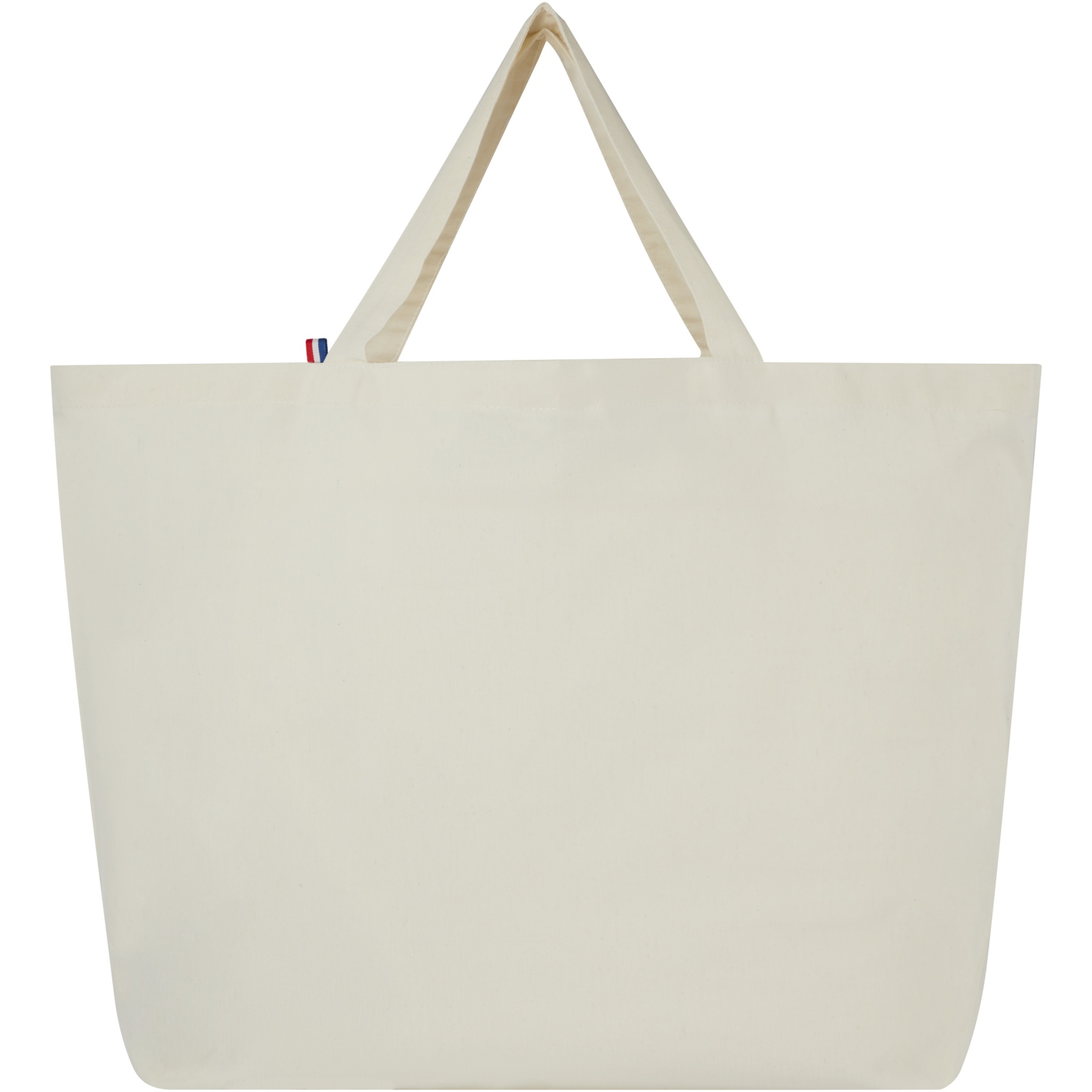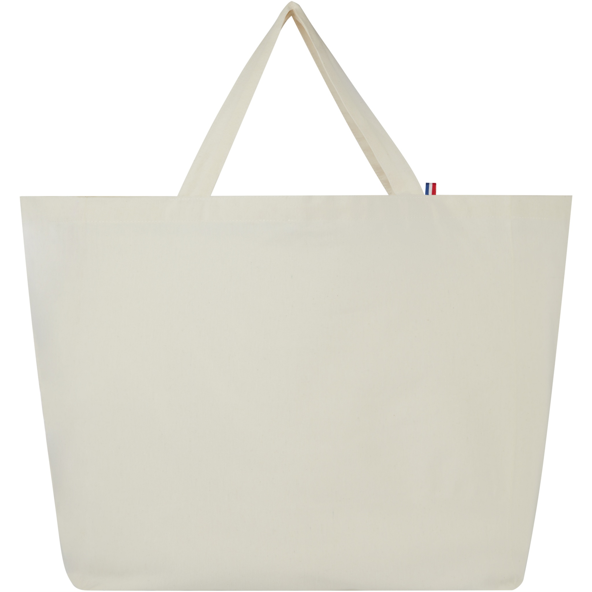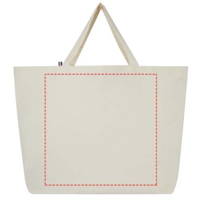 This large capacity tote bag is made with the finest, 100% recycled materials. It is constructed to use in everyday life, and suitable to carry around heavy books or groceries. The 200 g/m² recycled cotton/polyester blend ensures durability and reliability, giving the bag a resistance of up to 14kg weight. The yarns originate in Asia, but the weaving, spinning and manufacturing is all done in France.