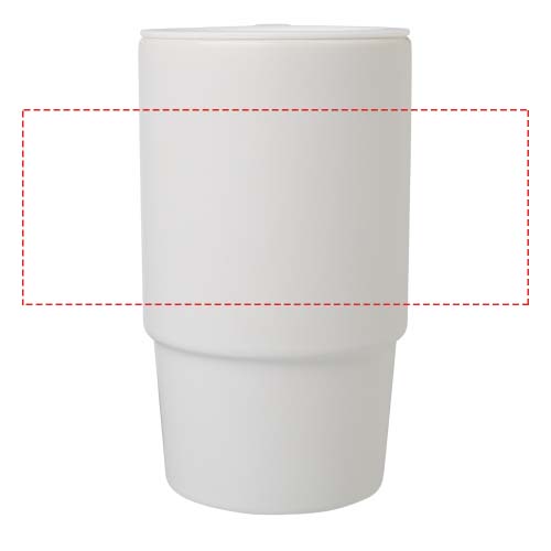 Ceramic mug featuring a large oversized handle for easy carrying, and a spill-proof plastic lid for convenience on the go. The exterior has a stylish matte finish, and the bottle is dishwasher safe for all print methods. Presented in a recycled cardboard gift box. Volume capacity: 450 ml.