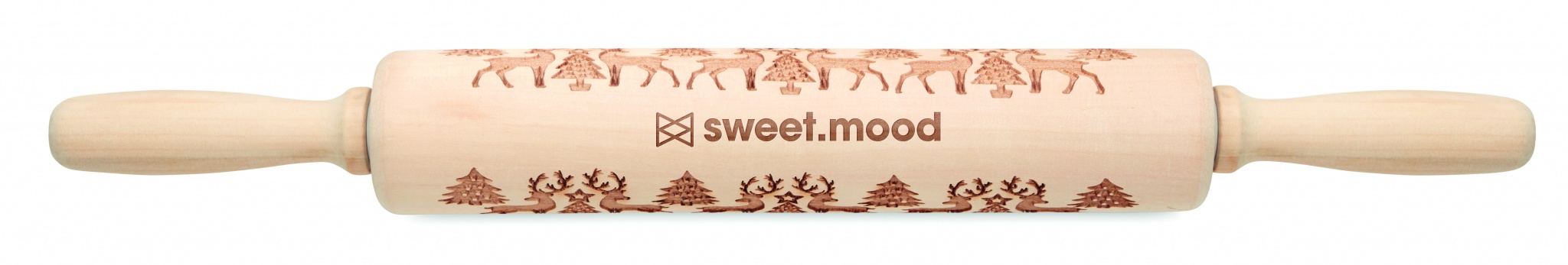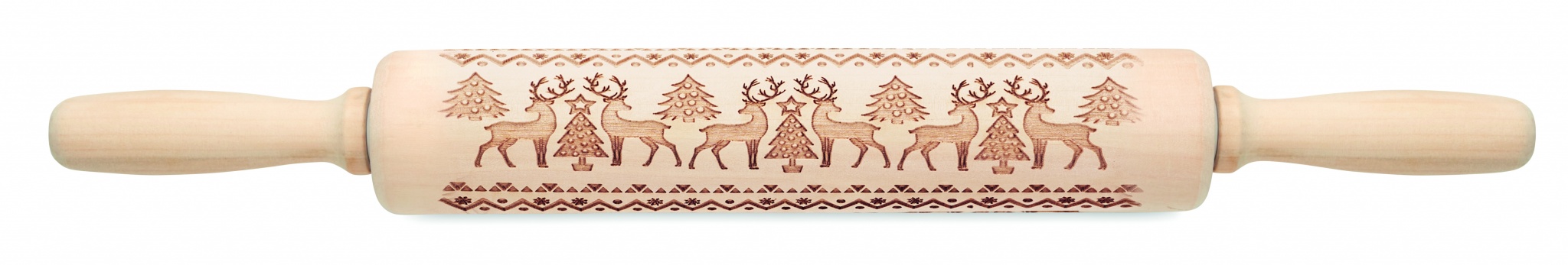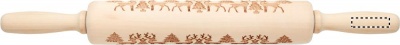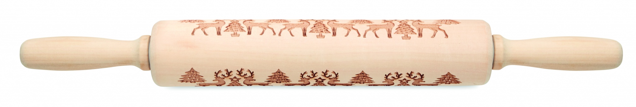 Wooden pastry rolling pin with debossed Christmas pattern.