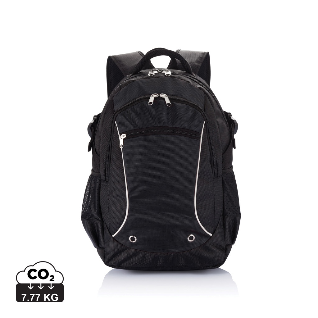 1680D and jacquard backpack. Zippered front pocket with organiser. Zippered main compartment with 15,6” padded laptop pocket. Reflective piping. Two side mesh pockets. PVC free.
