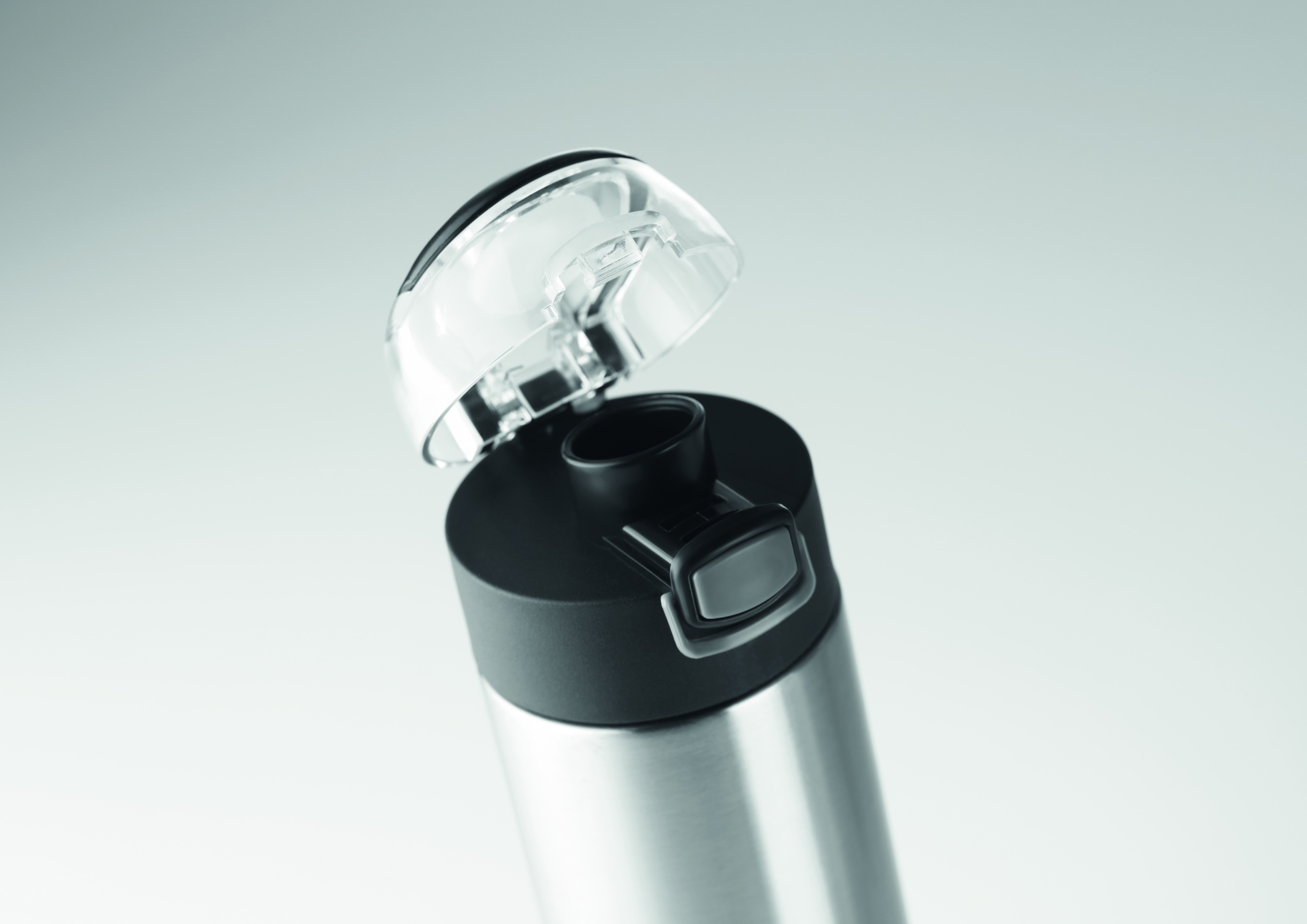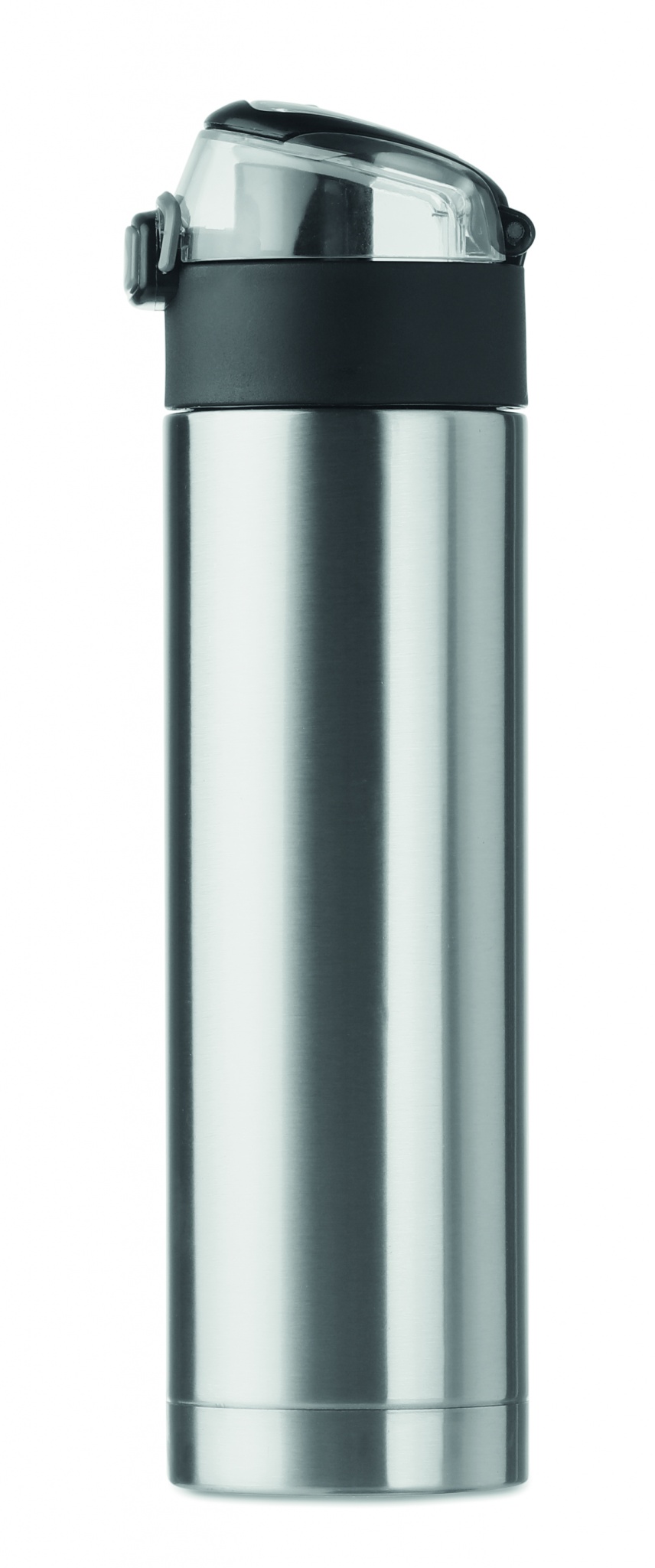 Double wall drinking bottle in stainless steel with security lock on the lid and press-to-open option. It has an easy carry foldable grip. 400 ml. Leak free. Leak free.
