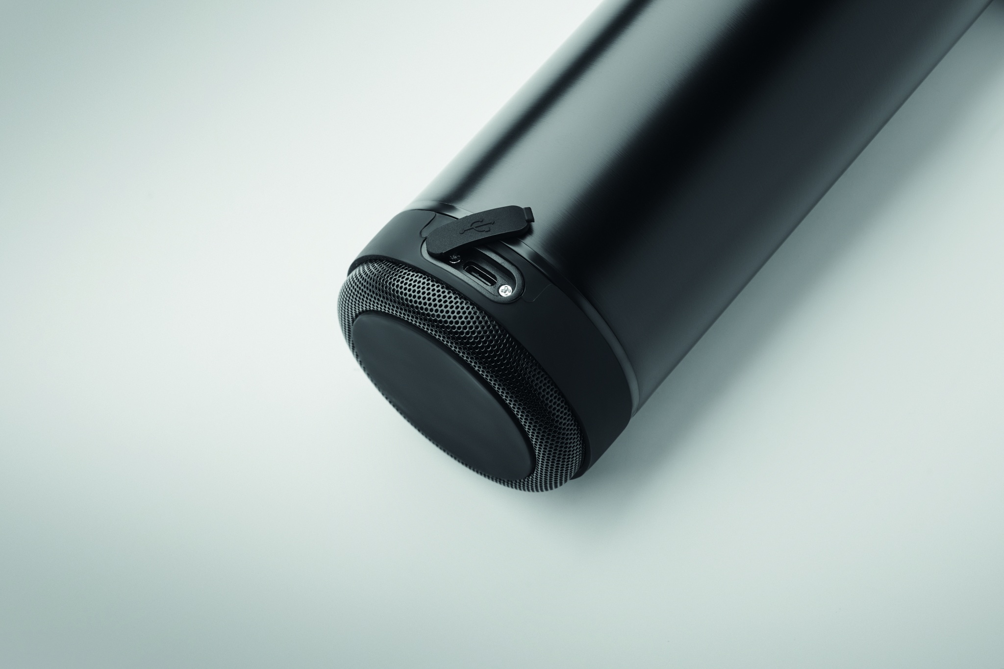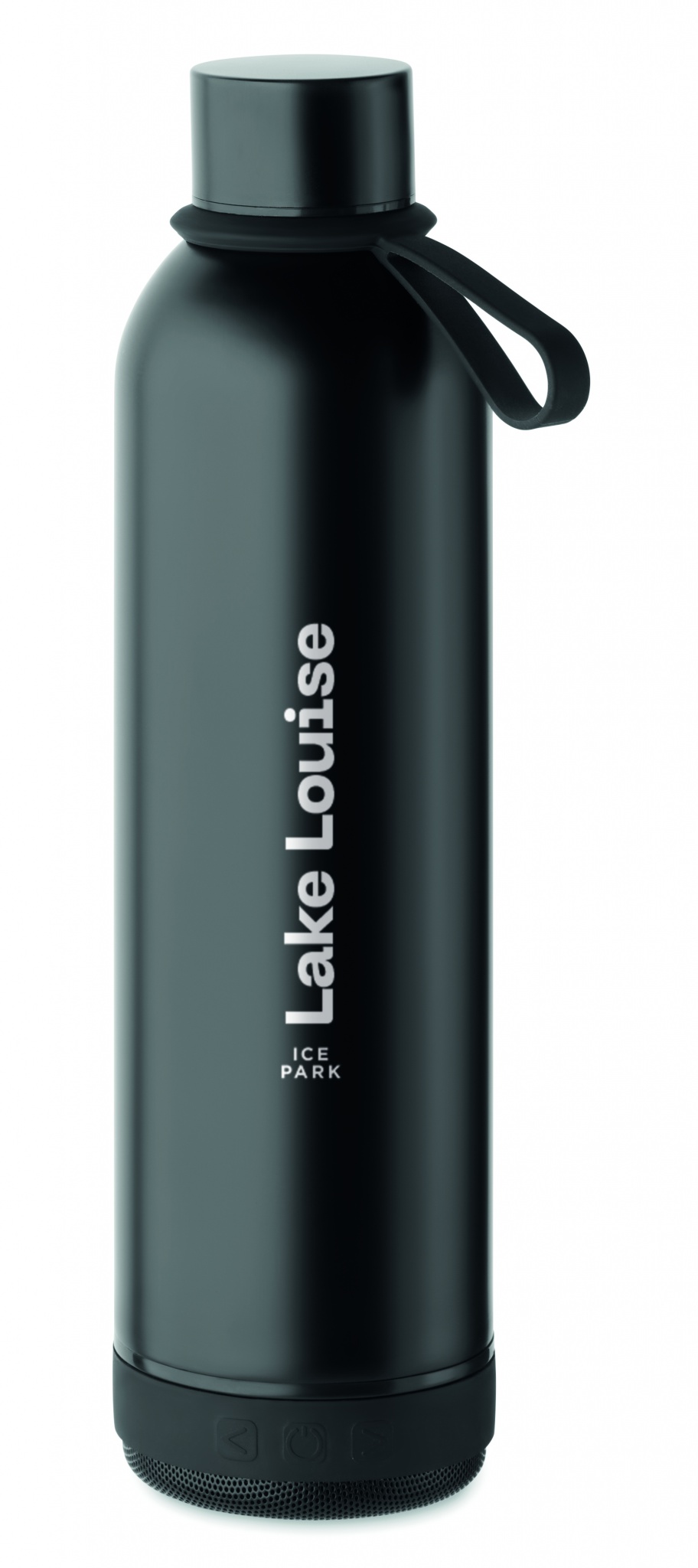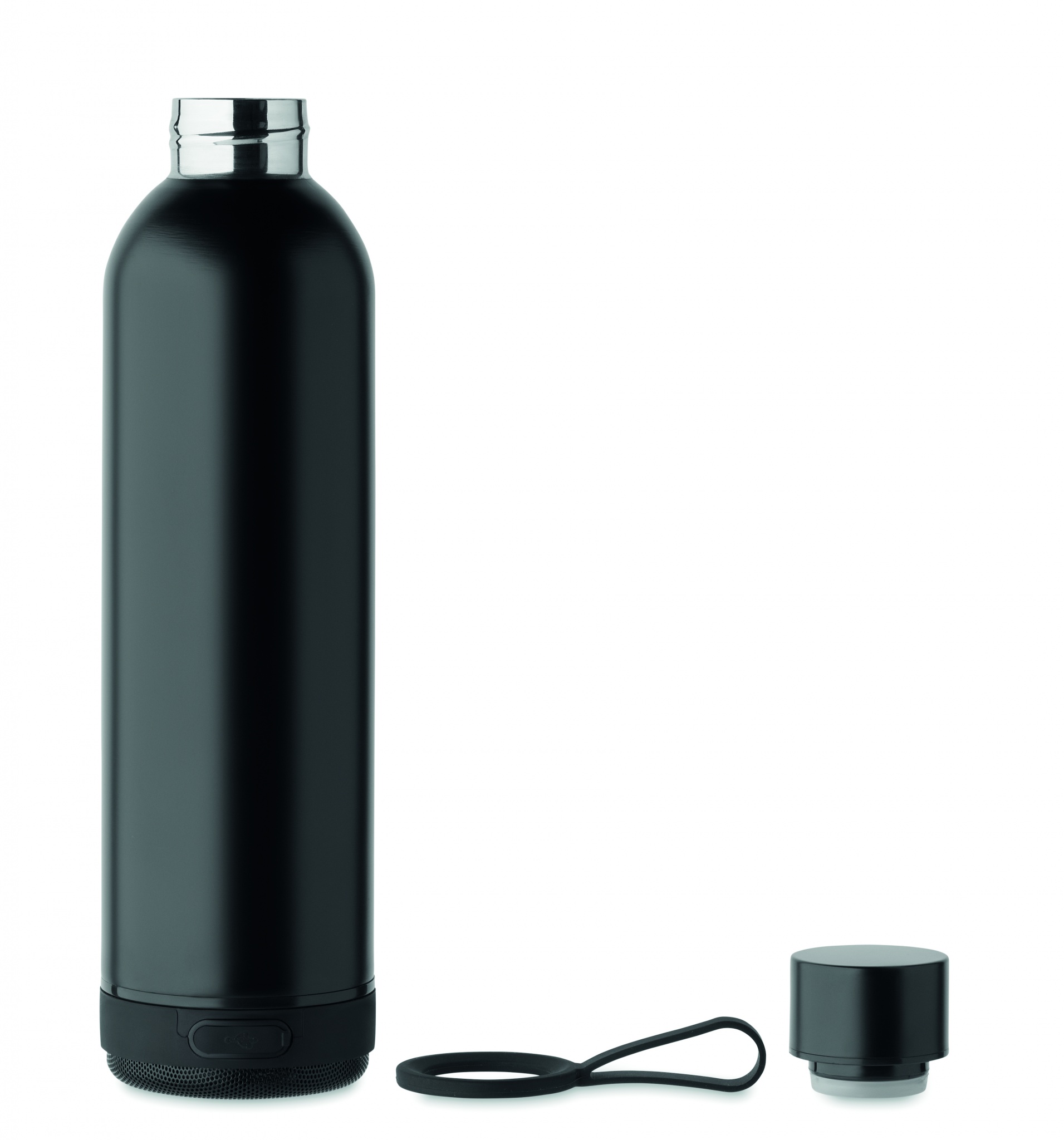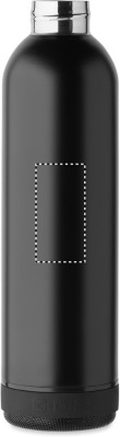 Double wall vacuum insulating bottle in recycled stainless steel (90% recycled stainless steel and 10% stainless steel) and silicone carry handle with detachable 3W wireless speaker. Capacity: 500 ml. 500 mAh battery. Remove speaker for cleaning. Leak-free.