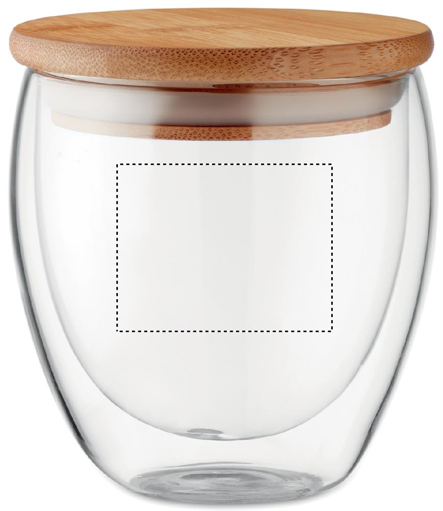 Double wall high borosilicate glass with bamboo lid with silicone ring. Capacity 250 ml. Bamboo is a natural product, there may be slight variations in colour and size per item, which can affect the final decoration outcome.