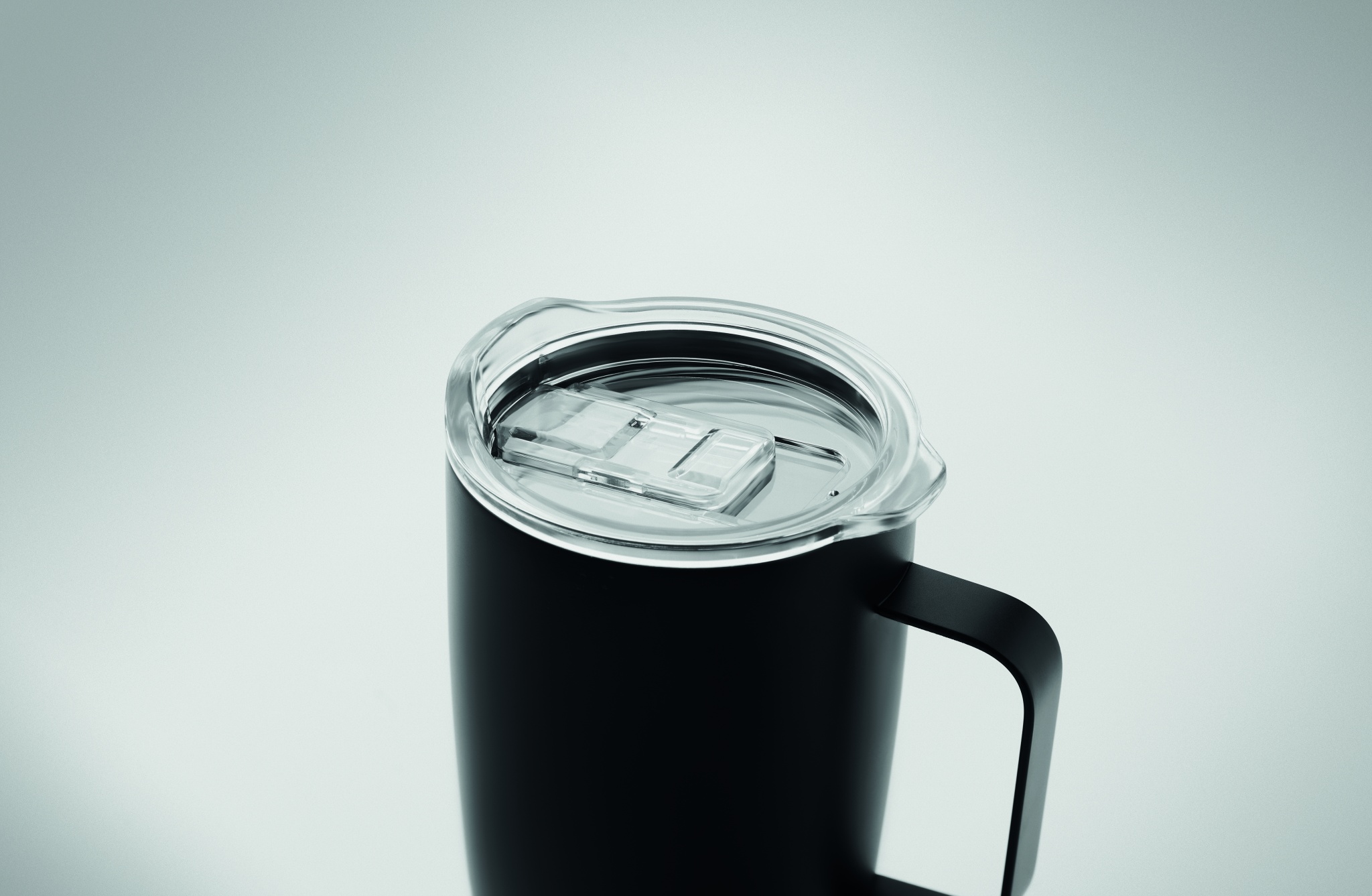 Double wall stainless steel mug with cork base and sliding sip hole cover. Capacity: 300 ml. Cork is 100% natural material. Due to its structural nature and surface porosity the final print result per item may have deviations.
