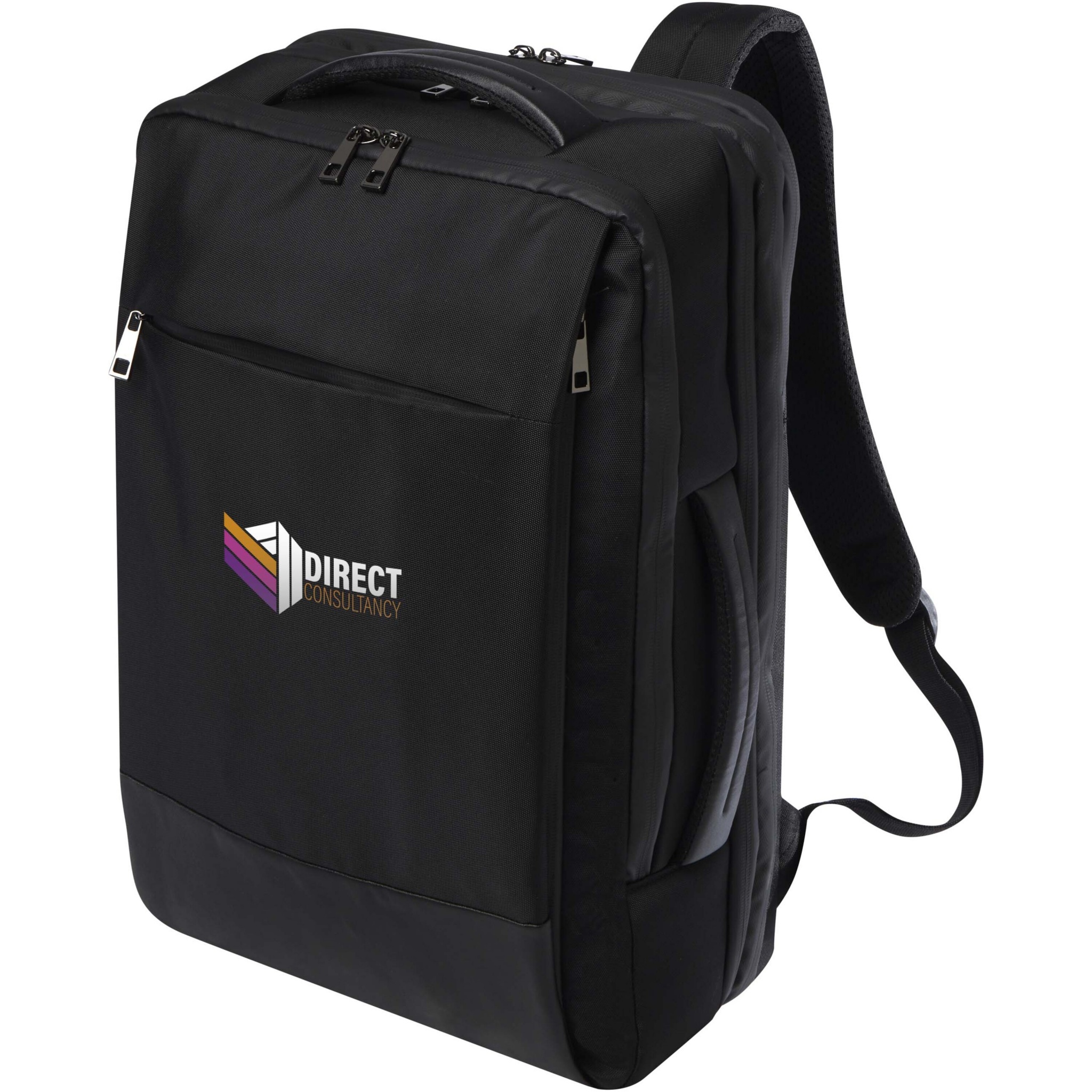 The expandable and sturdy GRS certified Expedition Pro laptop backpack is the ultimate choice for professionals constantly needing to juggle travel and work. The backpack has expanded capacity equivalent to a carry-on trolley, and it's made from water repellent RPET, coupled with premium PU elements and RPET lining. It features a dedicated 17" laptop compartment and a tablet sleeve, an expandable trolley style compartment for storing clothing, an integrated leak-proof large pocket for toiletries, and a spacious front compartment with multiple organisational pockets inside and outside. Constructed with padded and adjustable shoulder straps, an integrated card sleeve pocket, a sunglasses loop, moulded air mesh backing as well as a padded handle, ensuring maximum carrying comfort and convenience. Volume capacity: 35 litres. PVC free.