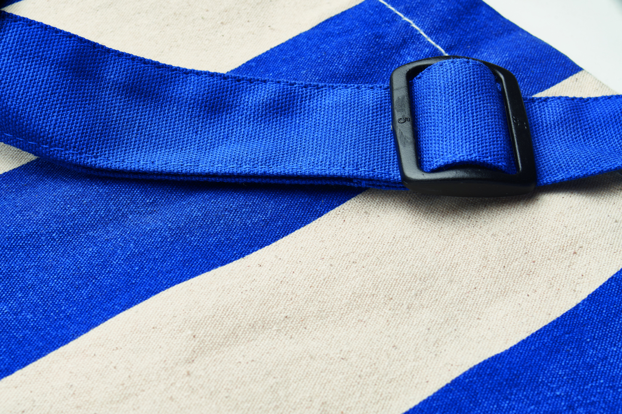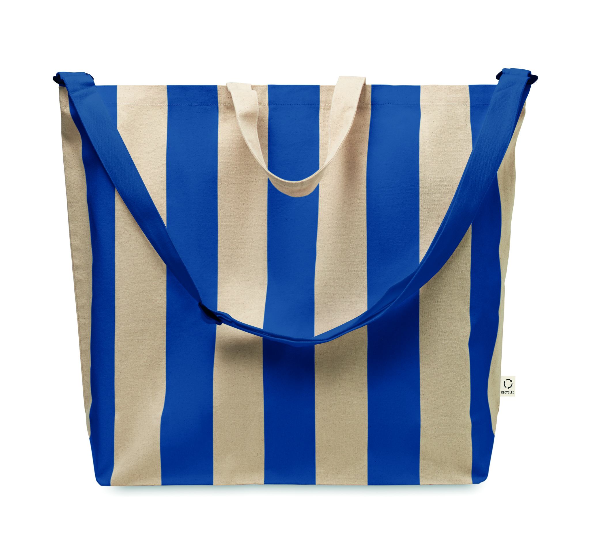 Extra large striped beach bag in 280 gr/m² recycled cotton (80%) and recycled polyester (20%) with inner pocket. Short handles and one large adjustable shoulder strap.