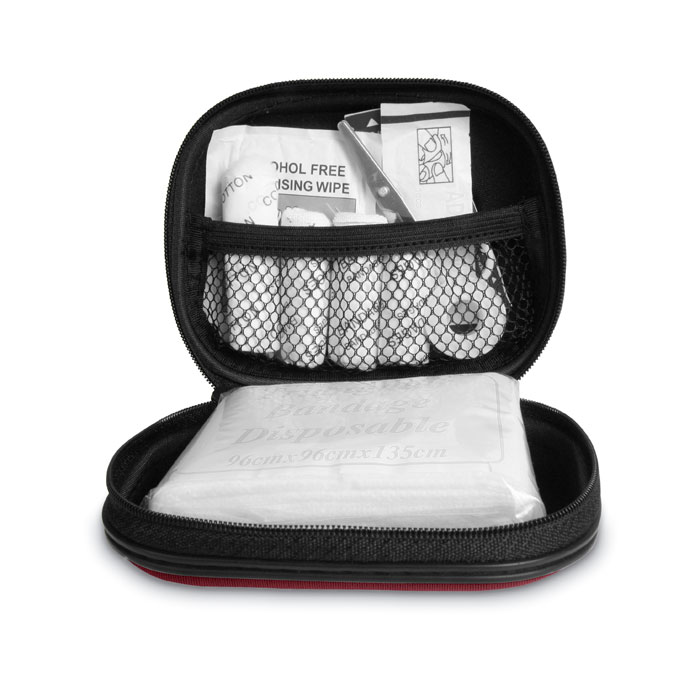 First aid kit in EVA material. Includes 1 pair of scissors, 3 pad bandages, 1 triangular bandage, 1 roll of cotton, 2 cleaning tissues, 5 adhesive bandages, 1 roll of tape and 6 cotton buds.