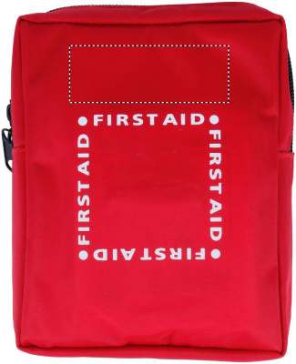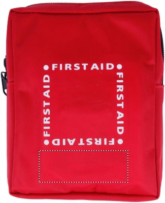 First aid kit. Includes 1 emergency blanket and tweezers, 10 cotton tips, 1 pair gloves, 2 wound pad, 1 adhesive tape and triangular bandage, 4 adhesive bandages, 6 alcohol-free wipes, 1 short and long bandage. Presented in 230D pouch.