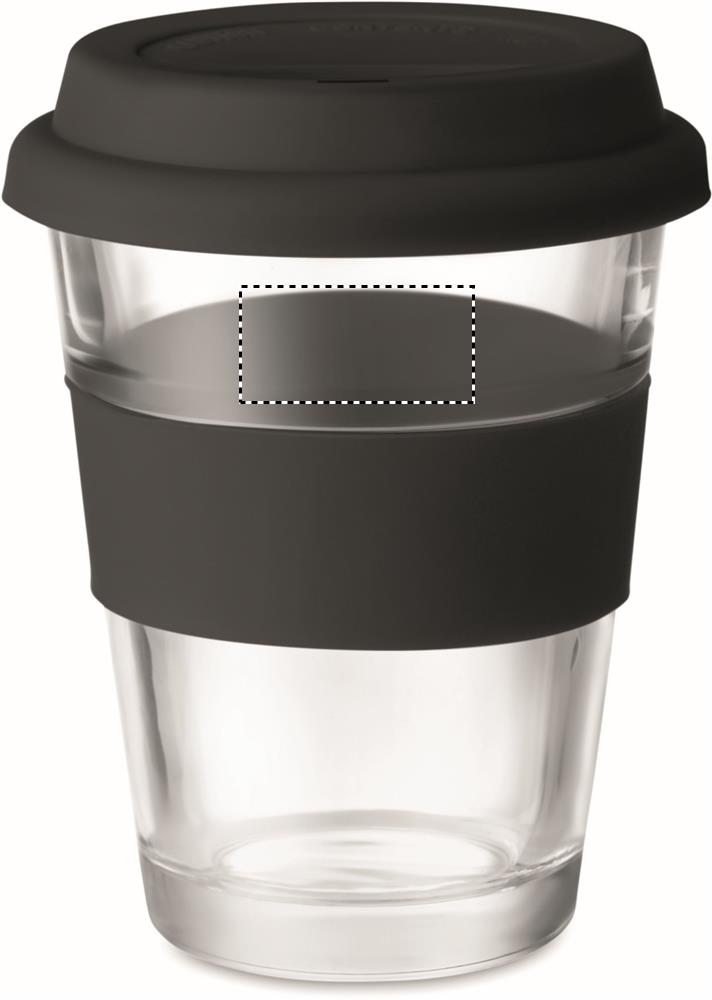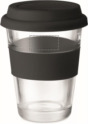 Glass tumbler with silicone lid and grip. Capacity 350 ml. As this is a single wall mug heat transfer can still occur.