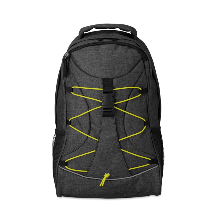 Backpack in 600D 2 tone polyester with colourful contrasting facing and glow in the dark cord on the front panel. Mesh pockets on both sides.