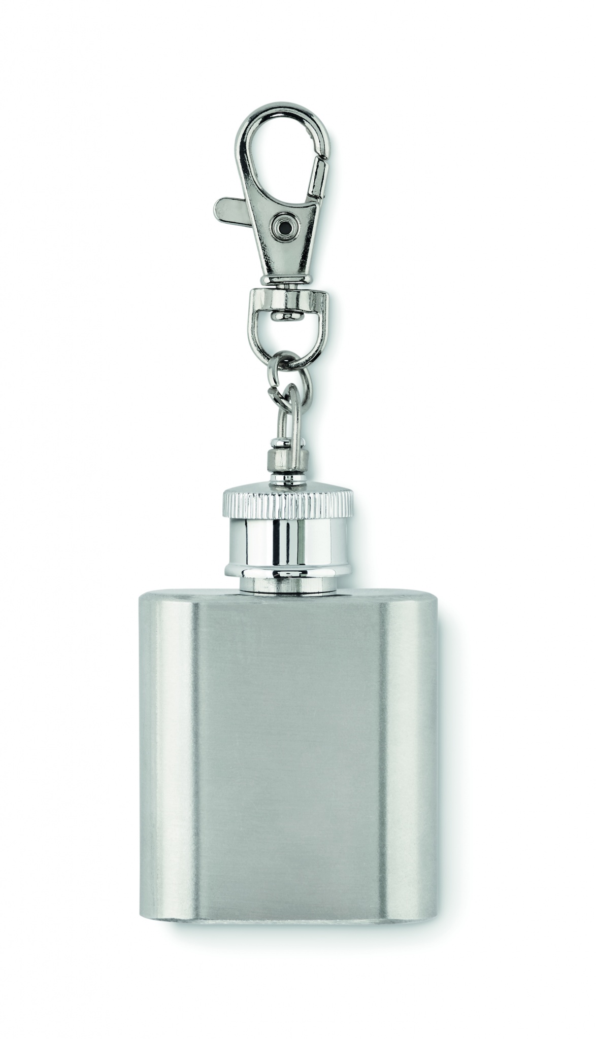 Hipflask key ring in stainless steel. Capacity: 28 ml.