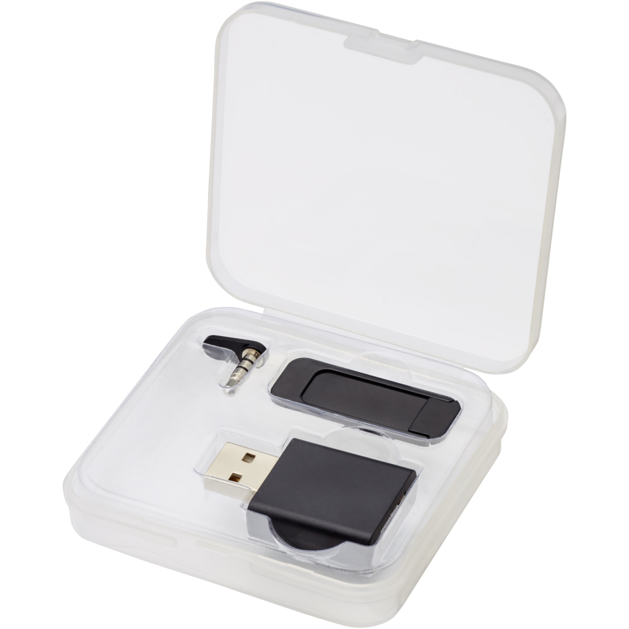 Digital privacy kit including a USB data blocker, a webcam blocker, and an audio jack blocker. The USB data protector prevents accidental data exchange when connecting a mobile device to a computer or public charging station. The item will block any data transfer while the device is being charged, preventing data from being stolen or malware being installed. The webcam blocker can be attached in front of the laptop webcam to block any unwanted access to the the webcam. The audio jack blocker can be placed in the AUX port of the device to avoid third parties listening in to conversations. Delivered in a protective box.