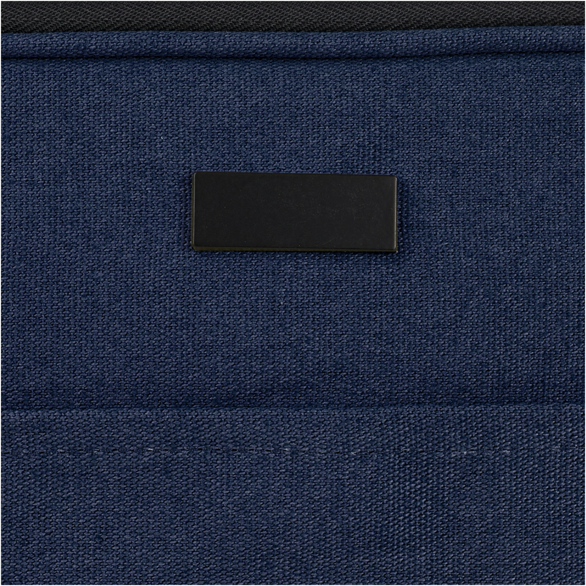 Composed with highly durable and sustainable materials, GRS recycled canvas and GRS RPET lining, the Joey 14" laptop sleeve features a protected laptop compartment, and an open front pocket with hook & loop closure. The decorative metal plate can make a logo shine through its subtle and matt finish.