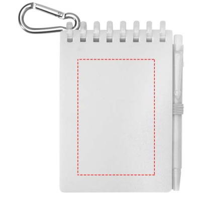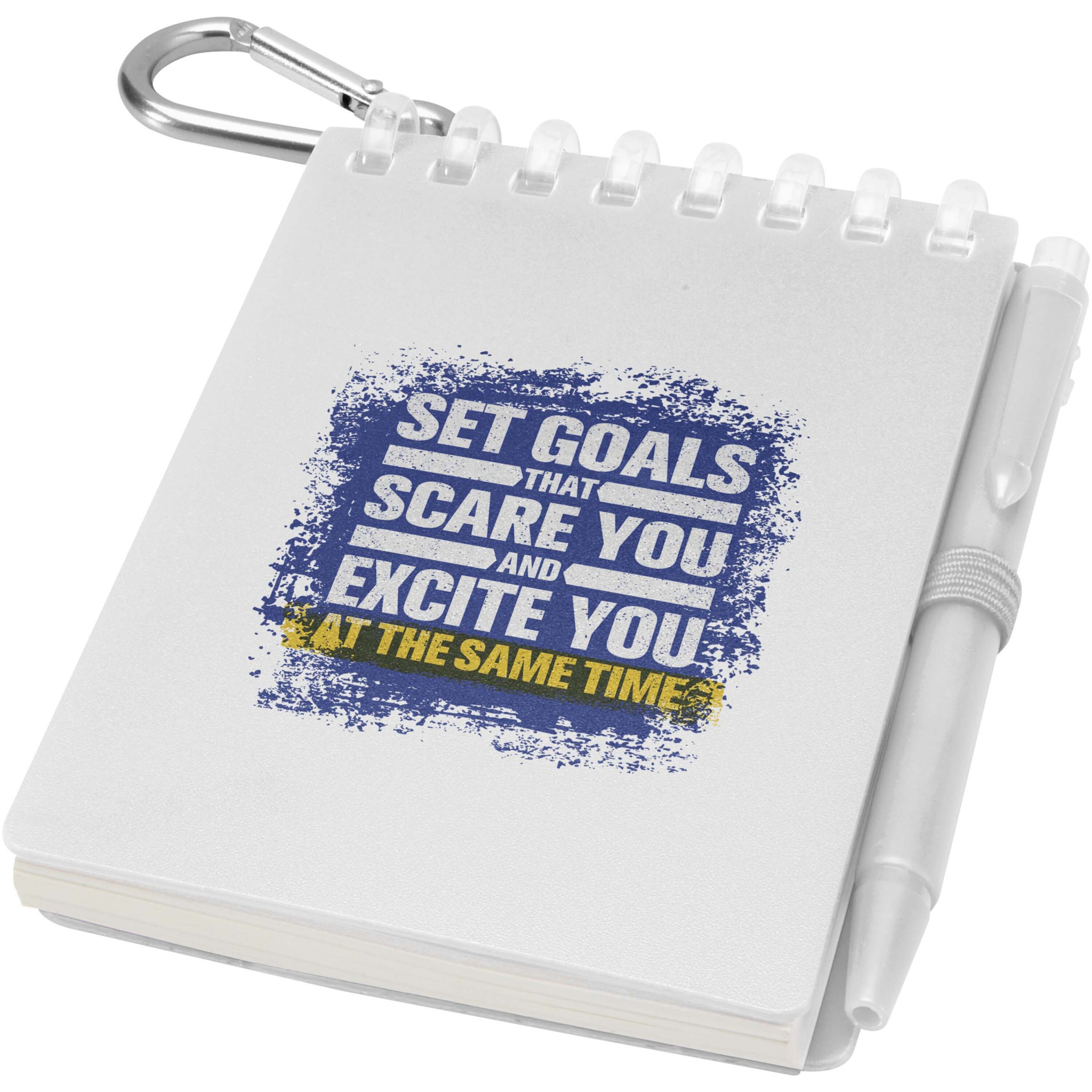 The Lig Mini notebook and pen set is a compact and practical companion for on-the-go note-taking. The spiral-bound notebook has a soft recycled plastic cover and 70 blank sheets of 120 g/m² water-resistant stone paper, making it ideal for outdoor use. With rounded corners and a built-in pen loop, it embraces the mini-size trend while remaining functional. The matching ballpoint pen is made from recycled ABS plastic, writes in black ink, and offers a writing length of 250 metres. A colour-coordinated metal ring allows the set to be easily attached to a backpack, purse, or keychain, making it perfect for durable and portable note-taking. Notebook size: 11 × 7.5 cm.