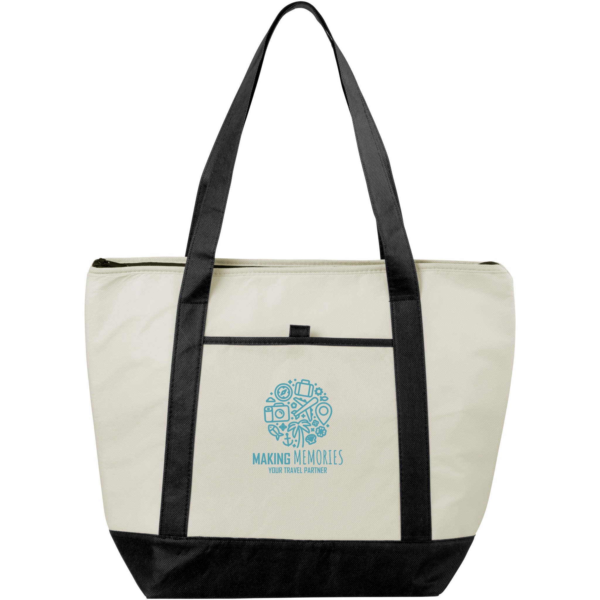 The sleek-designed Lighthouse cooler tote looks like an ordinary bag, but looks can be deceiving. Put a cold can in the large main compartment, close the zipper, and the product will stay refrigerated. The 28 cm long handles make the bag easy to carry on the shoulder. The cooler bag has an open front pocket and pen loop (accessories not included). The cooler tote consists of 80 g/m² PP plastic, a versatile and lightweight material.