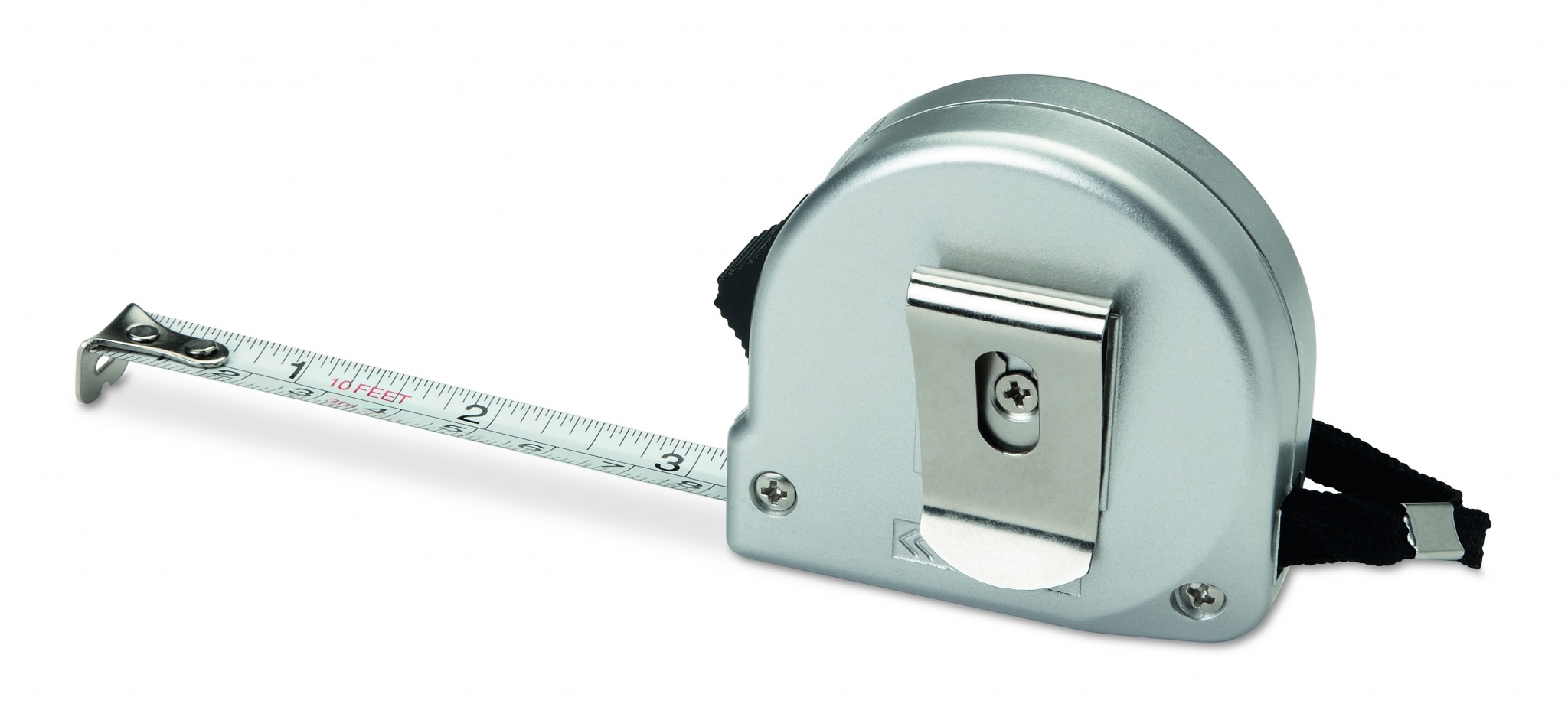 2m ABS measuring tape in matt silver case. Includes hand strap and shiny silver metal clip.