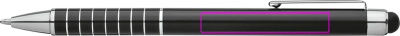 Twist ball metal pen with touch function and blue writing refill. 8 engraved rings make the writing convenient. Your logo will be laser engraved below the clip.